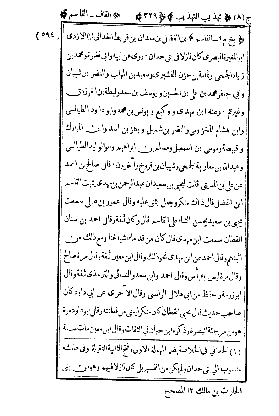 1 الحداني في الخلاصة بضم المهملة الأولي وفتح الثانية الثقيلة وفي هامشه منسوب إلي بني حدان ولم يكن من أنفسهم بل كان نازلا فيهم وهو من بني الحارث بن مالك 12 المصحح