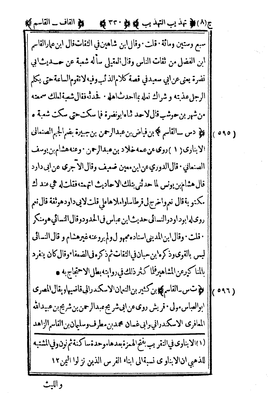 598– "ت س – القاسم" بن كثير بن النعمان الإسكندراني قاضيها ويقال المصري أبو العباس مولى قريش روى عن أبي شريح عبد الرحمن بن شريح بن عبيد الله المعافري الإسكندراني وأبي غسان محمد بن مطرف وسليمان بن القاسم الزاهد