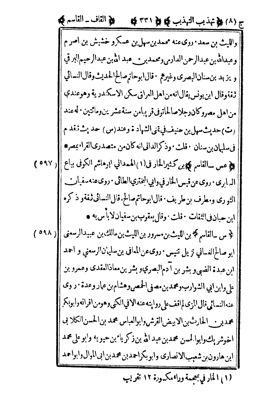 600- "س – القاسم" بن الليث بن مسرور بن الليث بن مالك بن عبيد الرسعني أبو صالح الغساني نزيل تنيس روى عن المعافى بن سليمان الرسعني وأحمد بن عبدة الضبي وبشر بن آدم البصري وبشر بن معاذ العقدي وعمرو بن علي وابن أبي الشوارب ومحمد بن مصفى الحمصي وهشام بن عمار وعدة روى عنه النسائي قال المزي لم أقف على روايته عنه إلا في الكنى وهو من أقرانه وأبو بكر محمد بن الحارث بن الأبيض القرشي وأبو العباس محمد بن الحسن الكلابي أخو شريك وأبو الحسن محمد بن عبد الله بن زكريا بن حيويه وأبو علي محمد بن هارون بن شعيب الأنصاري وأبو بكر أحمد بن محمد بن أبي الموال وأبو أحمد