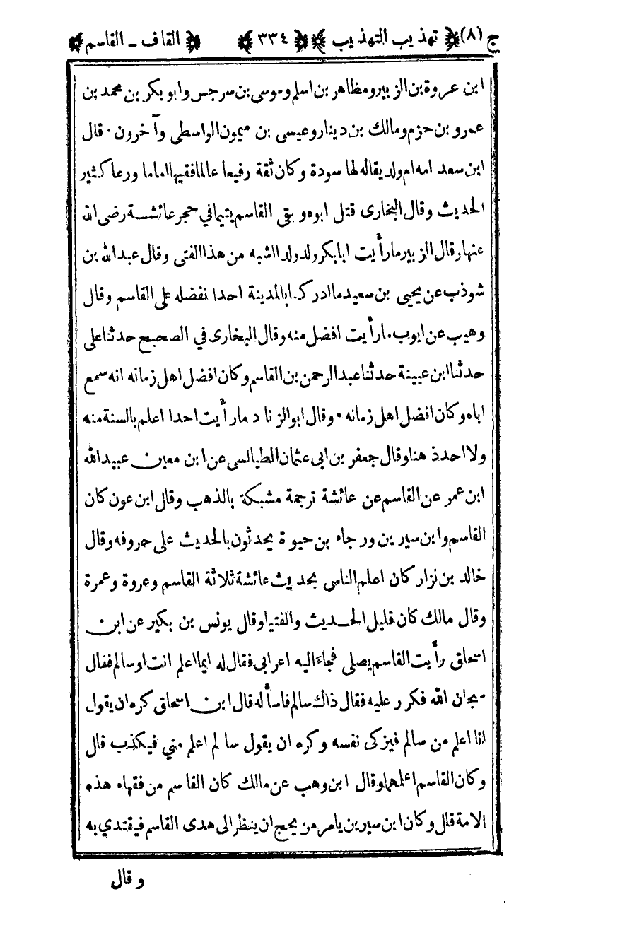 بن عروة بن الزبير ومظاهر بن أسلم وموسى بن سرجس وأبو بكر بن محمد بن عمرو بن حزم ومالك بن دينار وعيسى بن ميمون الواسطي وآخرون قال بن سعد أمه أم ولد يقال لها سودة وكان ثقة رفيعا عالما فقيها إماما ورعا كثير الحديث وقال البخاري قتل أبوه وبقي القاسم يتيما في حجر عائشة رضي الله عنها وقال الزبير ما رأيت أبا بكر ولد ولدا أشبه من هذا الفتى وقال عبد الله بن شوذب عن يحيى بن سعيد ما أدركنا بالمدينة أحدا نفضله على القاسم وقال وهيب عن أيوب ما رأيت أفضل منه وقال البخاري في الصحيح حدثنا علي حدثنا بن عيينة حدثنا عبد الرحمن بن القاسم وكان أفضل أهل زمانه أنه سمع أباه وكان أفضل أهل زمانه وقال أبو الزناد ما رأيت أحدا أعلم بالسنة منه ولا أحد ذهنا وقال جعفر بن أبي عثمان الطيالسي عن بن معين عبيد الله بن عمر عن القاسم عن عائشة ترجمة مشبكة بالذهب وقال بن عون كان القاسم وابن سيرين ورجاء بن حيوة يحدثون بالحديث على حروفه وقال خالد بن نزار كان أعلم الناس بحدث عائشة ثلاثة القاسم وعروة وعمرة وقال مالك كان قليل الحديث والفتيا وقال يونس بن بكير عن بن إسحاق رأيت القاسم يصلي فجاء إليه أعرابي فقال له أيما أعلم أنت أو سالم فقال سبحان الله فكرر عليه فقال ذاك سالم فاسأله قال بن إسحاق كره أن يقول أنا أعلم من سالم فيزكي نفسه وكره أن يقول سالم أعلم مني فيكذب قال وكان القاسم أعلمهما وقال بن وهب عن مالك كان القاسم من فقهاء هذه الأمة قال وكان بن سيرين يأمر من يحج أن ينظر إلى هدى القاسم فيقتدي به