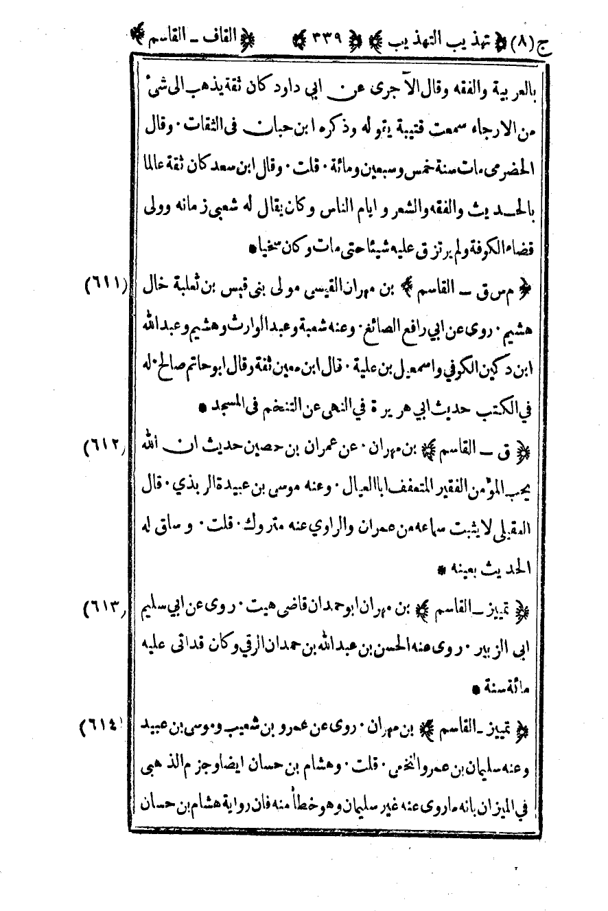 613– "م س ق – القاسم" بن مهران القيسي مولى بني قيس بن ثعلبة خال هشيم روى عن أبي رافع الصائغ وعنه شعبة وعبد الوارث وهشيم وعبد الله بن دكين الكوفي وإسماعيل بن علية قال بن معين ثقة وقال أبو حاتم صالح له في الكتب حديث أبي هريرة في النهي عن التنخم في المسجد