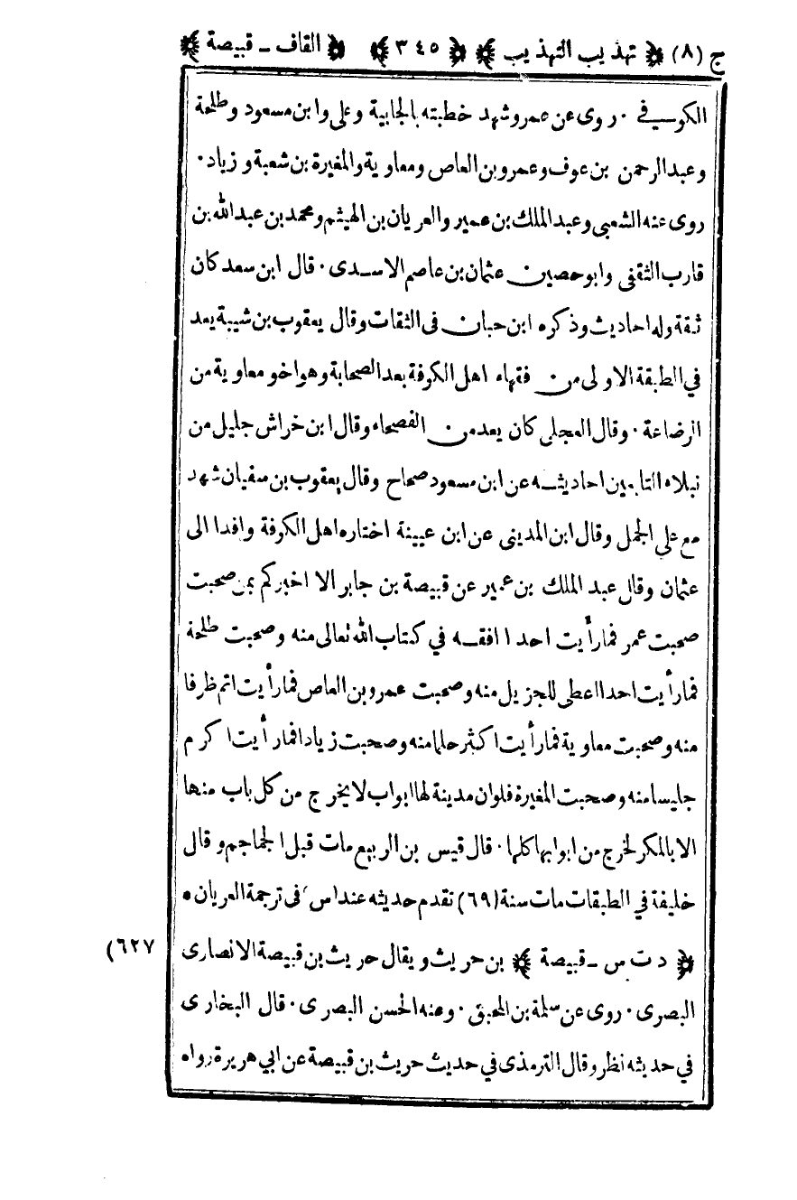 629-" د ت س – قبيصة" بن حريث ويقال حريث بن قبيصة الأنصاري البصري روى عن سلمة بن المحبق وعنه الحسن البصري قال البخاري في حديثه نظر وقال الترمذي في حديث حريث بن قبيصة عن أبي هريرة رواه