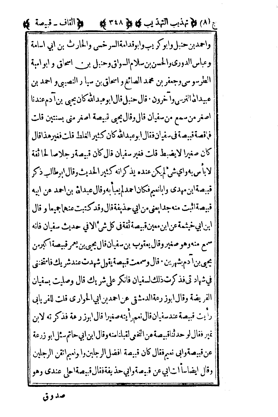 وأحمد بن حنبل وأبو كريب وأبو قدامة السرخسي والحارث بن أبي أسامة وعباس الدوري والحسن بن سلام السواق وحنبل بن إسحاق وأبو أمية الطرسوسي وجعفر بن محمد وإسحاق بن سيار النصيبي وأحمد بن عبيد الله النرسي وآخرون قال حنبل قال أبو عبد الله كان يحيى بن آدم عندنا أصغر من سمع من سفيان قال وقال يحيى قبيصة أصغر مني بسنتين قلت فما قصة قبيصة في سفيان فقال أبو عبد الله كان كثير الغلط قلت فغير هذا قال كان صغيرا لا يضبط قلت فغير سفيان قال كان قبيصة رجلا صالحا ثقة لا بأس به وأي شيء لم يكن عنده يذكر أنه كثير الحديث وقال أبو طالب ذكر قبيصة بن مهدي وأبا نعيم فكأن أحمد لم يعبأ به وقال عبد الله بن أحمد عن أبيه قبيصة أثبت منه جدا يعني من أبي حذيفة قال وقد كتبت عنهما جميعا وقال بن أبي خيثمة عن بن معين قبيصة ثقة في كل شيء إلا في حديث سفيان فإنه سمع منه وهو صغير وقال يعقوب بن سفيان قال يحيى بن يعمر قبيصة أكبر من يحيى بن آدم بشهرين قال وسمعت قبيصة يقول شهدت عند شريك فامتحنني في شهادتي فذكرت ذلك لسفيان فأنكر على شريك قال وصليت بسفيان الفريضة وقال أبو زرعة الدمشقي عن أحمد بن أبي الحواري قلت للفريابي رأيت قبيصة عند سفيان قال نعم رأيته صغيرا قال أبو زرعة فذكرته لابن نمير فقال لو حدثنا قبيصة عن النخعي لقبلنا منه وقال بن أبي حاتم سئل أبو زرعة عن قبيصة وأبي نعيم فقال كان قبيصة أفضل الرجلين وأبو نعيم أتقن الرجلين وقال أيضا سألت أبي عن قبيصة وأبي حذيفة فقال قبيصة أحلى عندي وهو