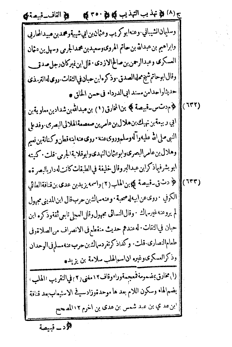 635- "د ت ق – قبيصة" بن الهلب2 واسمه يزيد بن عدي بن قنافة الطائي الكوفي روى عن أبيه له صحبة وعنه سماك بن حرب قال بن المديني مجهول لم يرو عنه غير سماك وقال النسائي مجهول وقال العجلي تابعي ثقة وذكره بن حبان في الثقات له عندهم حديث منقطع في الانصراف من الصلاة وفي طعام النصارى قلت وكذا ذكر تفرد سماك بن حرب عنه مسلم في الوحدان وذكر العسكري وغيره أن اسم الهلب سلامة بن يزيد