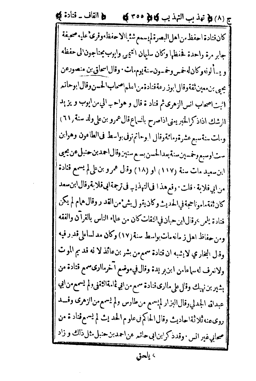 كان قتادة أحفظ من أهل البصرة لم يسمع شيئا إلا حفظه وقرئ عليه صحيفة جابر مرة واحدة فحفظها وكان سليمان التيمي وأيوب يحتاجون إلى حفظه ويسألونه وكان له خمس وخمسون سنة يوم مات وقال إسحاق بن منصور عن يحيى بن معين ثقة وقال أبو زرعة قتادة من أعلم أصحاب الحسن وقال أبو حاتم أثبت أصحاب أنس الزهري ثم قتادة قال وهو أحب إلي من أيوب ويزيد الرشك إذا ذكر الخبر يعني إذا صرح بالسماع قال عمرو بن علي ولد سنة 61 ومات سنة سبع عشرة ومائة وقال أبو حاتم توفي بواسط في الطاعون وهو بن ست أو سبع وخمسين سنة بعد الحسن بسبع سنين وقال أحمد بن حنبل عن يحيى بن سعيد مات سنة 117 أو 18 وقال عمرو بن علي لم يسمع قتادة من أبي قلابة قلت وقع هذا في التهذيب في ترجمة أبي قلابة وقال بن سعد كان ثقة مأمونا حجة في الحديث وكان يقول بشيء من القدر وقال همام لم يكن قتادة يلحن وقال بن حبان في الثقات كان من علماء الناس بالقرآن والفقه ومن حفاظ أهل زمانه مات بواسط سنة 17 وكان مدلسا على قدر فيه وقال البخاري لا يشبه أن قتادة سمع من بشر بن عائذ لأنه قديم الموت ولا نعرف له سماعا من بن بريدة وقال في موضع آخر ما أرى سمع قتادة من بشير بن نهيك وقال علي ما أرى قتادة سمع من أبي ثمامة الثقفي ولم يسمع من أبي عبد الله الجدلي وقال البزار لم يسمع من طاوس ولم يسمع من الزهري وقد روى عنه ثلاثة أحاديث وقال الحاكم في علوم الحديث لم يسمع قتادة من صحابي غير أنس وقد ذكر بن أبي حاتم عن أحمد بن حنبل مثل ذلك وزاد