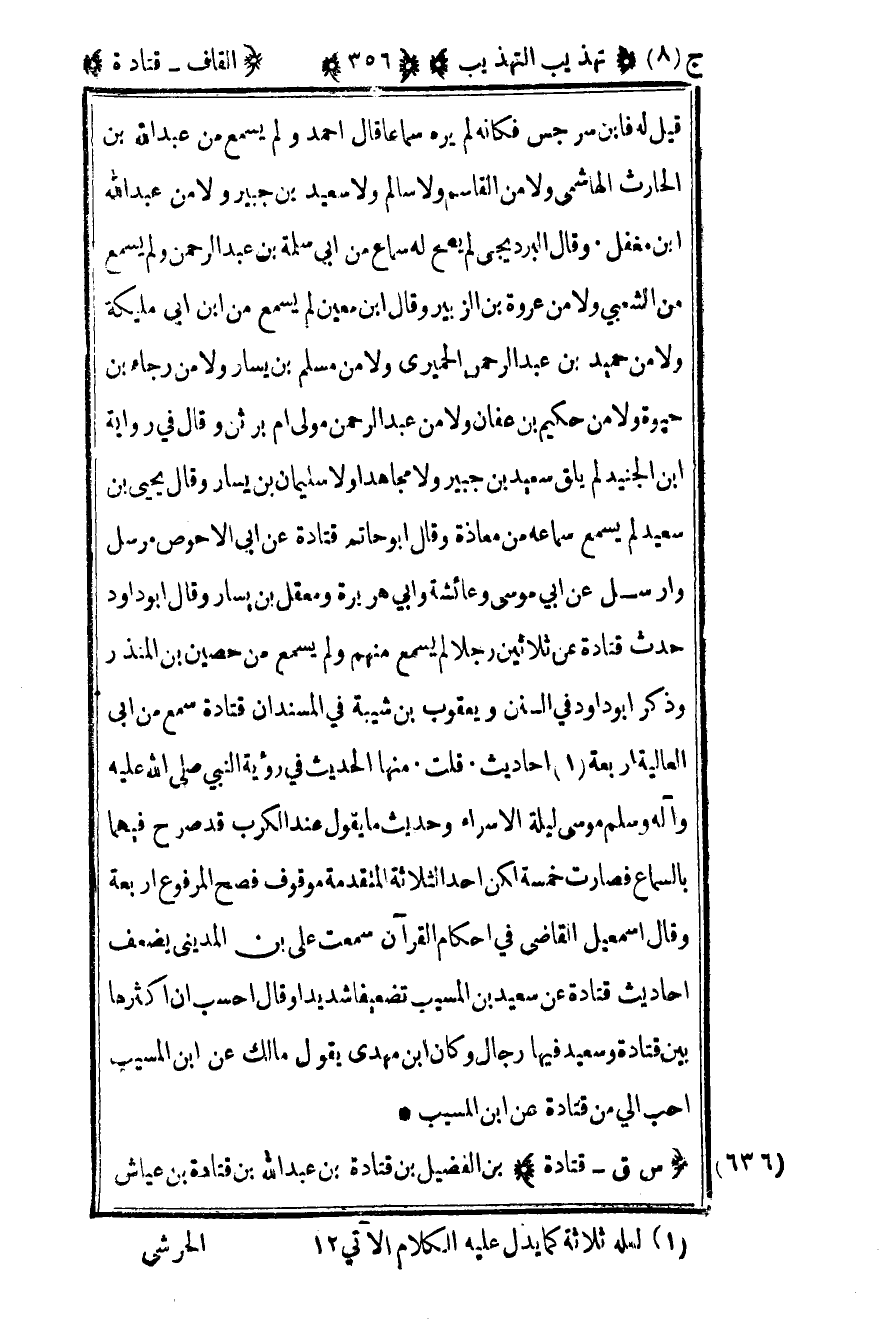 قيل له فابن سرجس فكأنه لم يره سماعا قال أحمد ولم يسمع من عبد الله بن الحارث الهاشمي ولا من القاسم ولا سالم ولا سعيد بن جبير ولا عبد الله بن مغفل وقال البرديجي لم يصح له سماع من أبي سلمة بن عبد الرحمن ولم يسمع من الشعبي ولا من عروة بن الزبير وقال بن معين لم يسمع من بن أبي مليكة ولا من حميد بن عبد الرحمن الحميري ولا من مسلم بن يسار ولا من رجاء بن حيوة ولا من حكيم بن عفان ولا من عبد الرحمن مولى أم برثن وقال في رواية بن الجنيد لم يلق سعيد بن جبير ولا مجاهدا ولا سليمان بن يسار وقال يحيى بن سعيد لم يسمع سماعه من معاذة وقال أبو حاتم قتادة عن أبي الأحوص مرسل وأرسل عن أبي موسى وعائشة وأبي هريرة ومعقل بن يسار وقال أبو داود حدث قتادة عن ثلاثين رجلا لم يسمع منهم ولم يسمع من حصين بن المنذر وذكر أبو داود في السنن ويعقوب بن شيبة في المسند أن قتادة سمع من أبي العالية أربعة1 أحاديث قلت منها الحديث في رؤية النبي صلى الله عليه وسلم موسى ليلة الإسراء وحديث ما يقول عند الكرب قد صرح فيهما بالسماع فصارت خمسة لكن أحد الثلاثة المتقدمة موقوف فصح المرفوع أربعة وقال إسماعيل القاضي في أحكام القرآن سمعت علي بن المديني يضعف أحاديث قتادة عن سعيد بن المسيب تضعيفا شديدا وقال أحسب أن أكثرها بين قتادة وسعيد فيها رجال وكان بن مهدي يقول مالك عن بن المسيب أحب إلي من قتادة عن بن المسيب