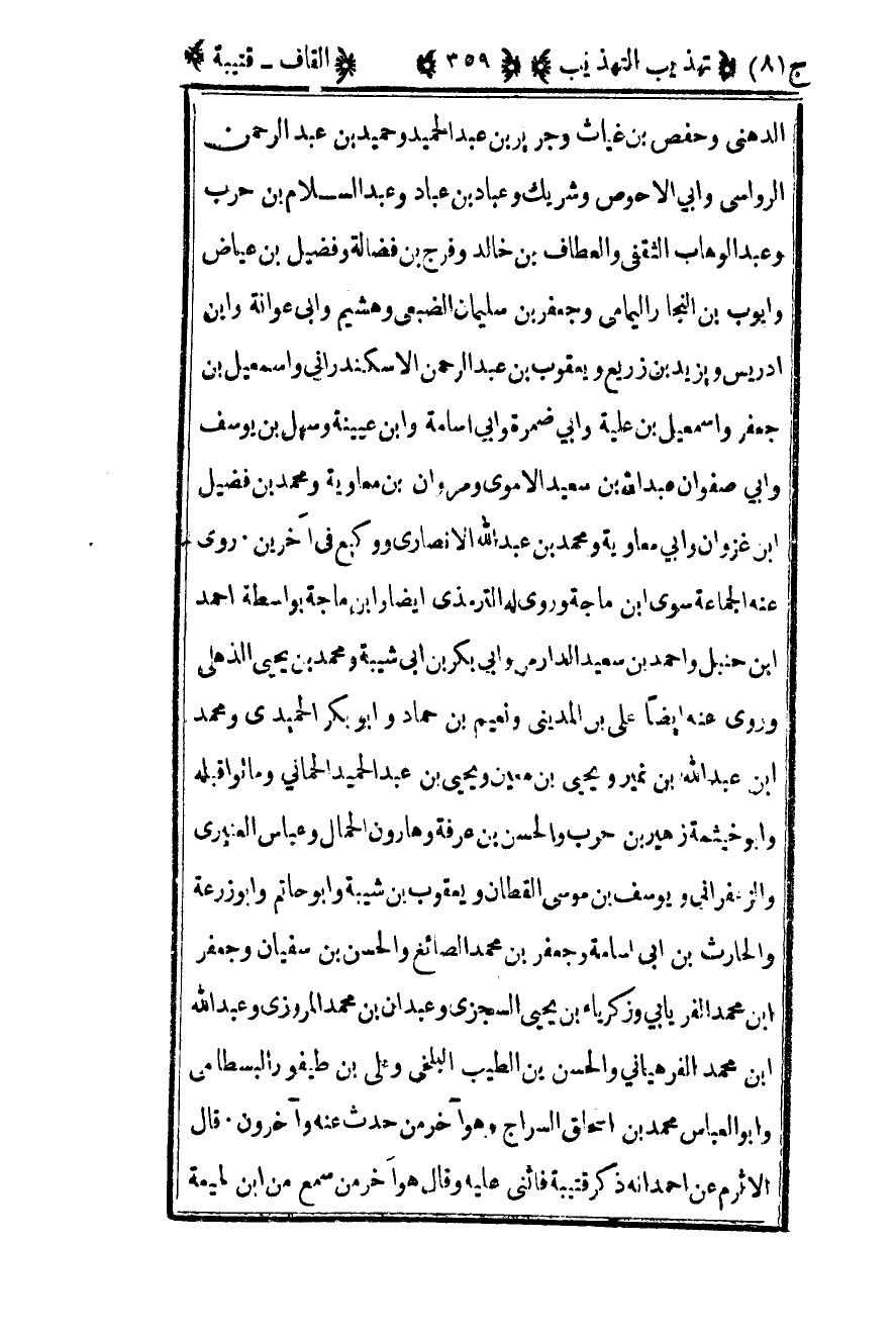 الدهني وحفص بن غياث وجرير بن عبد الحميد وحميد بن عبد الرحمن الرواسي وأبي الأحوص وشريك وعباد بن عباد وعبد السلام بن حرب وعبد الوهاب الثقفي والعطاف بن خالد وفرج بن فضالة وفضيل بن عياض وأيوب بن النجار اليمامي وجعفر بن سليمان الضبعي وهشيم وأبي عوانة وابن إدريس ويزيد بن زريع ويعقوب بن عبد الرحمن الإسكندراني وإسماعيل بن جعفر وإسماعيل بن علية وأبي ضمرة وأبي أسامة وابن عيينة وسهل بن يوسف وأبي صفوان عبد الله بن سعيد الأموي ومروان بن معاوية ومحمد بن فضيل بن غزوان وأبي معاوية ومحمد بن عبد الله الأنصاري ووكيع في آخرين روى عنه الجماعة سوى بن ماجة وروى له الترمذي أيضا وابن ماجة بواسطة أحمد بن حنبل وأحمد بن سعيد الدارمي وأبي بكر بن أبي شيبة ومحمد بن يحيى الذهلي وروى عنه أيضا علي بن المديني ونعيم بن حماد وأبو بكر الحميدي ومحمد بن عبد الله بن نمير ويحيى بن معين ويحيى بن عبد الحميد الحماني وماتوا قبله وأبو خيثمة زهير بن حرب والحسن بن عرفة وهارون الحمال وعباس العنبري والزعفراني ويوسف بن موسى القطان ويعقوب بن شيبة وأبو حاتم وأبو زرعة والحارث بن أبي أسامة وجعفر بن محمد الصائغ والحسن بن سفيان وجعفر بن محمد الفريابي وزكرياء بن يحيى السجزي وعبدان بن محمد المروزي وعبد الله بن محمد الفرهياني والحسن بن الطيب البلخي وعلي بن طيفور البسطامي وأبو العباس محمد بن إسحاق السراج وهو آخر من حدث عنه وآخرون قال الأثرم عن أحمد أنه ذكر قتيبة فأثنى عليه وقال هو آخر من سمع من بن لهيعة