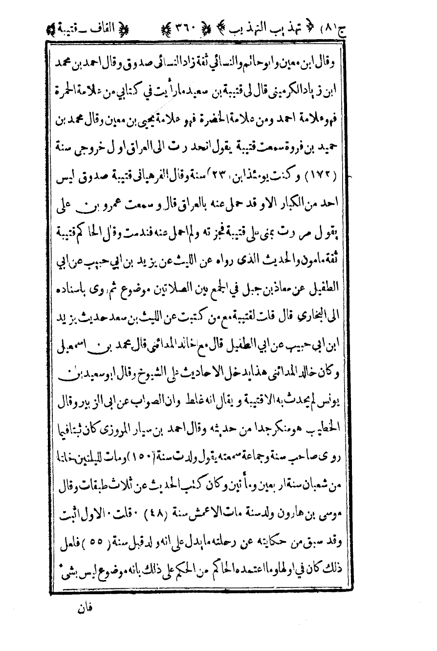 وقال بن معين وأبو حاتم والنسائي ثقة زاد النسائي صدوق وقال أحمد بن محمد بن زياد الكرميني قال لي قتيبة بن سعيد ما رأيت في كتابي من علامة الحمرة فهو علامة أحمد ومن علامة الخضرة فهو علامة يحيى بن معين وقال محمد بن حميد بن فروة سمعت قتيبة يقول انحدرت إلى العراق أول خروجي سنة 172 وكنت يومئذ بن 23 سنة وقال الفرهياني قتيبة صدوق ليس أحد من الكبار إلا وقد حمل عنه بالعراق قال وسمعت عمرو بن علي يقول مررت بمنى على قتيبة فجزته ولم أحمل عنه فندمت وقال الحاكم قتيبة ثقة مأمون والحديث الذي رواه عن الليث عن يزيد بن أبي حبيب عن أبي الطفيل عن معاذ بن جبل في الجمع بين الصلاتين موضوع ثم روى بإسناده إلى البخاري قال قلت لقتيبة مع من كتبت عن الليث بن سعد حديث يزيد بن أبي حبيب عن أبي الطفيل قال مع خالد المدائني قال محمد بن إسماعيل وكان خالد المدائني هذا يدخل الأحاديث على الشيوخ وقال أبو سعيد بن يونس لم يحدث به إلا قتيبة ويقال إنه غلط وأن الصواب عن أبي الزبير وقال الخطيب هو منكر جدا من حديثه وقال أحمد بن سيار المروزي كان ثبتا فيما روى صاحب سنة وجماعة سمعته يقول ولدت سنة 15 ومات لليلتين خلتا من شعبان سنة أربعين ومائتين وكان كتب الحديث عن ثلاث طبقات وقال موسى بن هارون ولد سنة مات الأعمش سنة 48 قلت الأول أثبت وقد سبق من حكايته عن رحلته ما يدل على أنه ولد قبل سنة "55" فلعل ذلك كان في أولها وما اعتمده الحاكم من الحكم على ذلك بأنه موضوع ليس بشيء