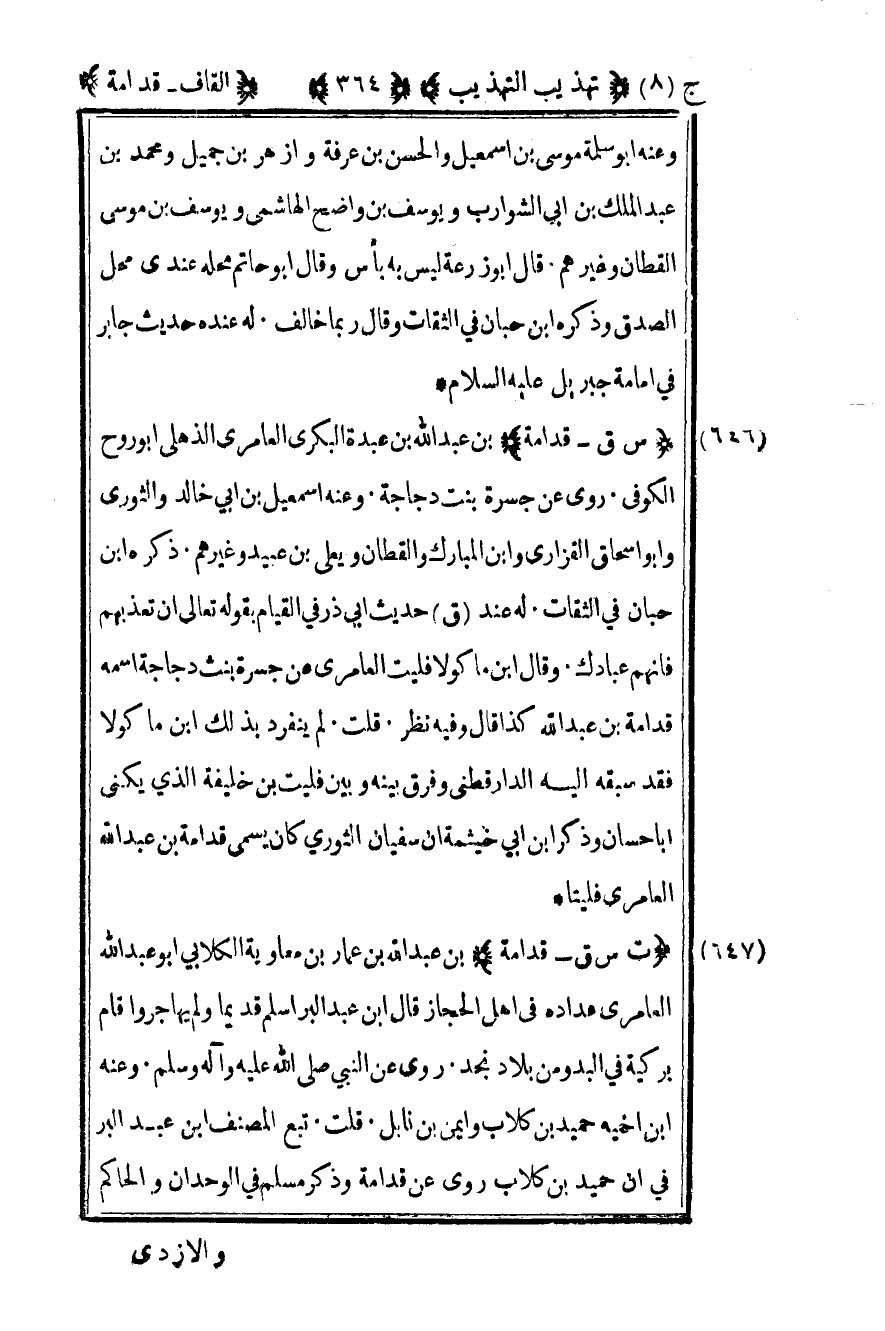 648– "س ق – قدامة" بن عبد الله بن عبدة البكري العامري الذهلي أبو روح الكوفي روى عن جسرة بنت دجاجة وعنه إسماعيل بن أبي خالد والثوري وأبو إسحاق الفزاري وابن المبارك والقطان ويعلى بن عبيد وغيرهم ذكره بن حبان في الثقات له عند ق حديث أبي ذر في القيام بقوله تعالى إن تعذبهم فإنهم عبادك وقال بن ماكولا فليت العامري عن جسرة بنت دجاجة اسمه قدامة بن عبد الله كذا قال وفيه نظر قلت لم ينفرد بذلك بن ماكولا فقد سبقه إليه الدارقطني وفرق بينه وبين فليت بن خليفة الذي يكنى أبا حسان وذكر بن أبي خيثمة أن سفيان الثوري كان يسمى قدامة بن عبد الله العامري فليتا