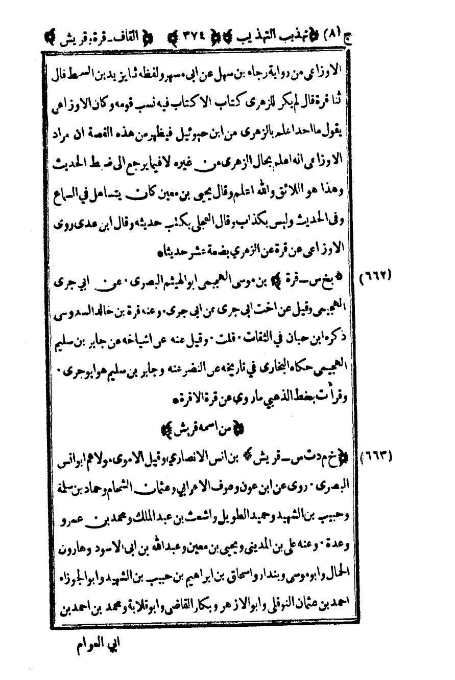 الوزاعي من رواية رجاء بن سهل عن أبي مسهر ولفظه ثنا يزيد بن السمط قال ثنا قرة قال لم يكن للزهري كتاب إلا كتاب فيه نسب قومه وكان الأوزاعي يقول ما أحد أعلم بالزهري من بن حيوئيل فيظهر من هذه القصة أن مراد الأوزاعي أنه أعلم بحال الزهري من غيره لا فيما يرجع إلى ضبط الحديث وهذا هو اللائق والله أعلم وقال يحيى بن معين كان يتساهل في السماع وفي الحديث وليس بكذاب وقال العجلي يكتب حديثه وقال بن عدي روى الأوزاعي عن قرة عن الزهري بضعة عشر حديثا
