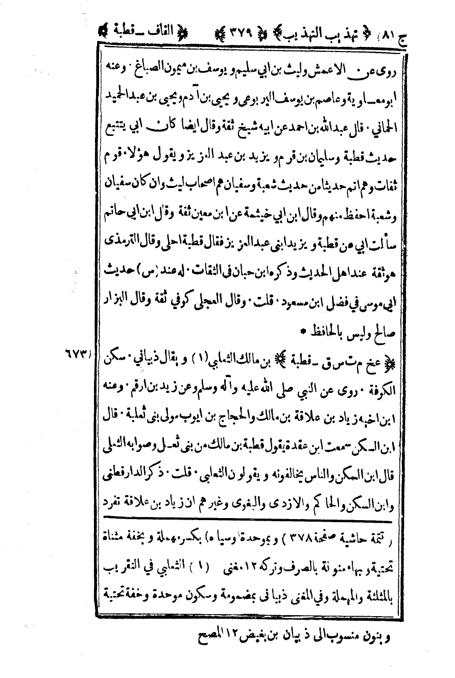 675– "عخ م ت س ق – قطبة" بن مالك الثعلبي1 ويقال ذبياني سكن الكوفة روى عن النبي صلى الله عليه وسلم وعن زيد بن أرقم وعنه بن أخيه زياد بن علاقة بن مالك والحجاج بن أيوب مولى بني ثعلبة قال بن السكن سمعت بن عقدة يقول قطبة بن مالك من بني ثعل وصوابه الثعلبي قال بن السكن والناس يخالفونه ويقولون الثعلبي قلت ذكر الدارقطني وابن السكن والحاكم والأزدي والبغوي وغيرهم أن زياد بن علاقة تفرد