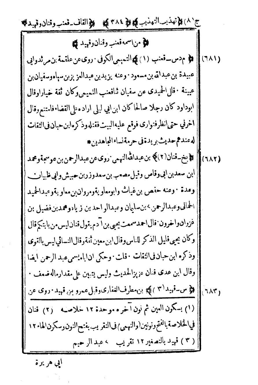 2 قنان في الخلاصة بالفتح ونونين والنهي في التقريب بفتح النون وسكون الهاء 12