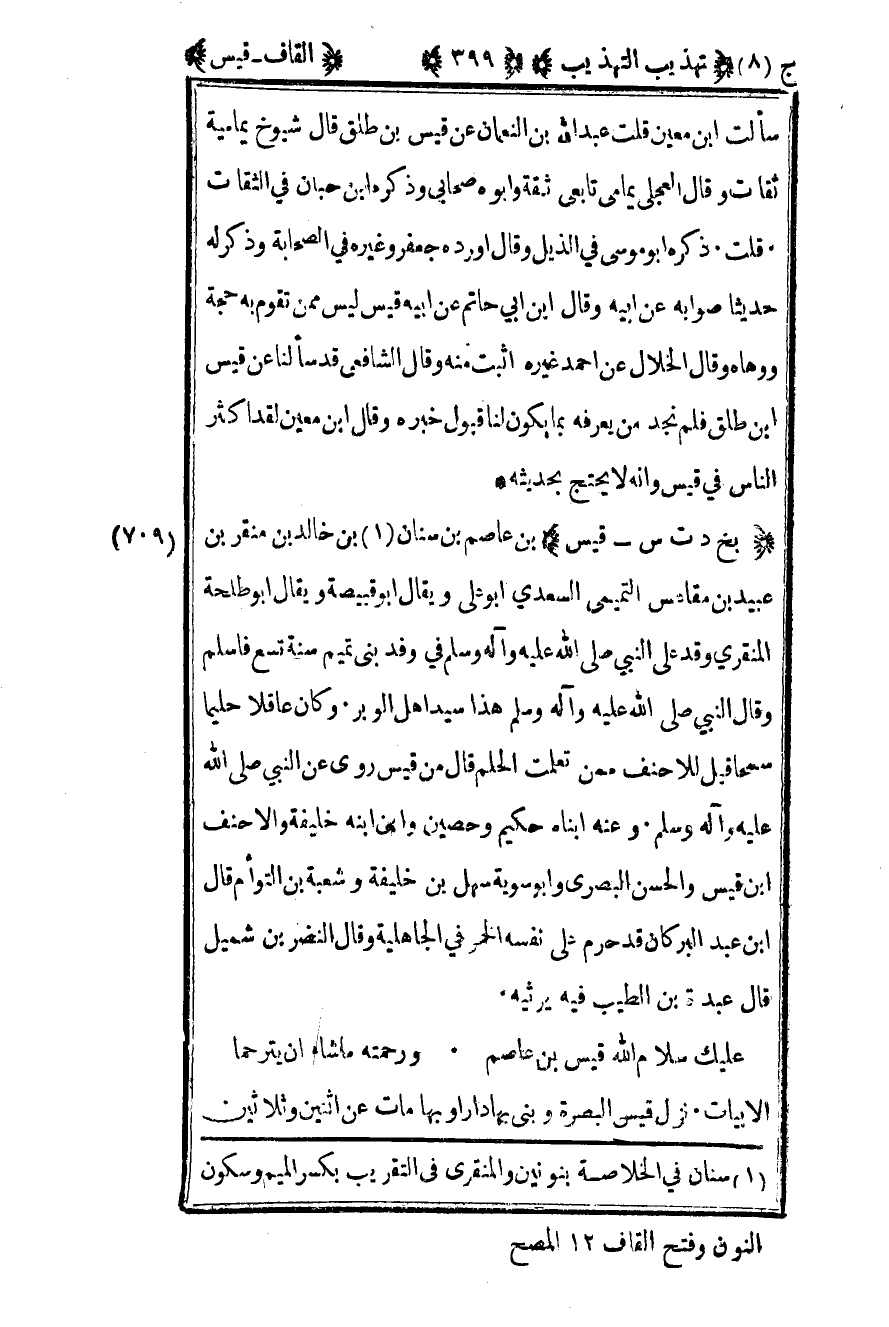 711 – "بخ د ت س – قيس" بن عاصم بن سنان1 بن خالد بن منقر بن عبيد بن مقاعس التميمي السعدي أبو علي ويقال أبو قبيصة ويقال أبو طلحة المنقري وفد على النبي صلى الله عليه وسلم في وفد بني تميم سنة تسع فأسلم وقال النبي صلى الله عليه وسلم "هذا سيد أهل الوبر" وكان عاقلا حليما سمحا قيل للأحنف ممن تعلمت الحلم قال من قيس روى عن النبي صلى الله عليه وسلم وعنه ابناه حكيم وحصين وابن ابنه خليفة والأحنف بن قيس والحسن البصري وأبو سوية سهل بن خليفة وشعبة بن التوأم قال بن عبد البر كان قد حرم على نفسه الخمر في الجاهلية وقال النضر بن شميل قال عبدة بن الطيب فيه يرثيه