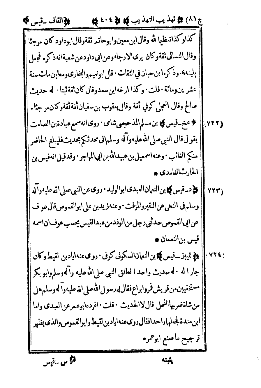 724- "عخ – قيس" بن مسلم المذحجي شامي روى أنه سمع عبادة بن الصامت يقول قال النبي صلى الله عليه وسلم "إني محدثكم بحديث فليبلغ الحاضر منكم الغائب" وعنه إسماعيل بن عبيد الله بن أبي المهاجر وقد قيل أنه قيس بن الحارث الغامدي