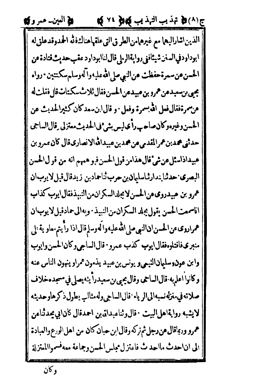 الذين أشار إليهما مع غيرهما من الطرق التي علقها هناك فلله الحمد وقد علق له أبو داود في السنن شيئا ففي رواية الرملي قال لنا أبو داود عقب حديث قتادة عن الحسن عن سمرة حفظت عن النبي صلى الله عليه وسلم سكتتين رواه يحيى بن سعيد عن عمرو بن عبيد عن الحسن فقال ثلاث سكتات قال فقلت له عن سمرة فقال فعل الله بسمرة وفعل وقال بن سعد كان كثير عن الحسن وغيره وكان صاحب رأي ليس بشيء في الحديث معتزلي قال الساجي حدثني محمد بن عمر المقدمي عن محمد بن عن محمد عبيد الله الأنصاري قال كان عمرو بن عبيد إذا سئل عن شيء قال هذا من قول الحسن فيوهمهم أنه من قول الحسن البصري حدثنا بندار ثنا سليمان بن حرب ثنا حماد بن زيد قال قيل لأيوب أن عمرو بن عبيد روى عن الحسن لا يجلد السكران من النبيذ فقال أيوب كذاب أنا سمعت الحسن يقول يجلد السكران من النبيذ وبه إلى حماد قيل لأيوب إن عمرا روى عن الحسن أن النبي صلى الله عليه وسلم قال إذا رأيتم معاوية على منبري فاقتلوه فقال أيوب كذب عمرو قال الساجي وكان الحسن وأيوب وابن عون وسليمان التيمي ويونس بن عبيد يذمون عمرا وينهون الناس عنه وكانوا أعلم به قال الساجي وقال يحيى بن سعيد رأيته يصلي في مسجده خلاف صلاته في منزله نسبه إلى الرياء قال الساجي وله مثالب يطول ذكرها وحديثه لا يشبه رواية أهل البيت قال وثنا عبد الله بن أحمد قال كان أبي يحدثنا عن عمرو وربما قال عن رجل ثم تركه وقال بن حبان كان من أهل الورع والعبادة إلى أن أحدث ما أحدث فاعتزل مجلس الحسن وجماعة معه فسموا المعتزلة
