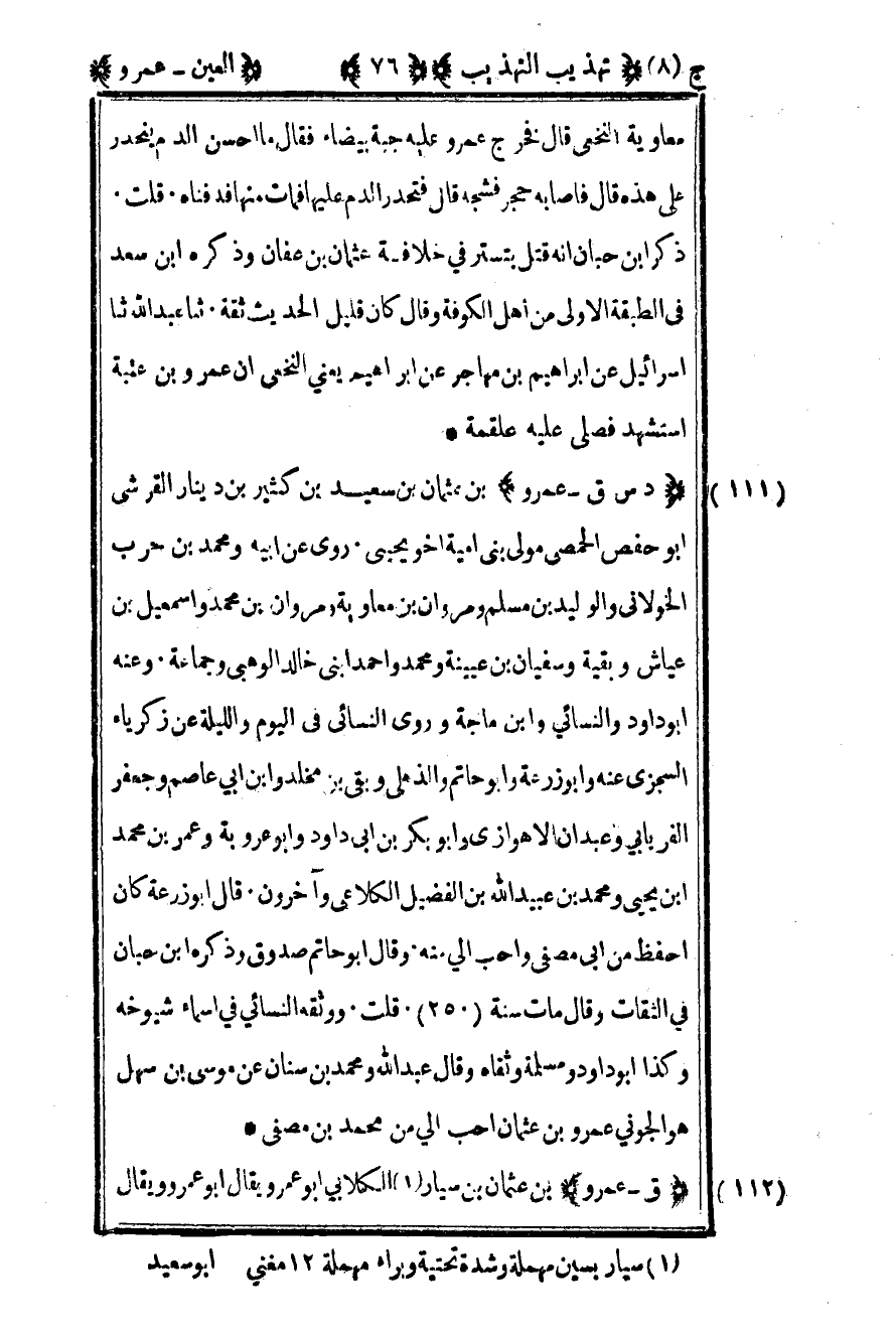 111- "د س ق – عمرو" بن عثمان بن سعيد بن كثير بن دينار القرشي أبو حفص الحمصي مولى بني أمية أخو يحيى روى عن أبيه ومحمد بن حرب الخولاني والوليد بن مسلم ومروان بن معاوية ومروان بن محمد وإسماعيل بن عياش وبقية وسفيان بن عيينة ومحمد وأحمد ابني خالد الوهبي وجماعة وعنه أبو داود والنسائي وابن ماجة وروى النسائي في اليوم واللية عن زكريا السجزي عنه وأبو زوعة وأبو حاتم والذهلي وبقي بن مخلد وابن أبي عاصم وجعفر الفريابي وعبدان الأهوازي وأبو بكر بن أبي داود وأبو عروبة وعمر بن محمد بن يحيى ومحمد بن عبيد الله بن الفضيل الكلاعي وآخرون قال أبو زرعة كان أحفظ من أبي مصفى وأحب إلي منه وقال أبو حاتم صدوق وذكره بن حبان في الثقات وقال مات سنة 25 قلت ووثقه النسائي في أسماء شيوخه وكذا أبو داود ومسلمة وثقاه وقال عبد الله ومحمد بن سنان عن موسى بن سهل هو الجوني عمرو بن عثمان أحب إلي من محمد بن مصفى