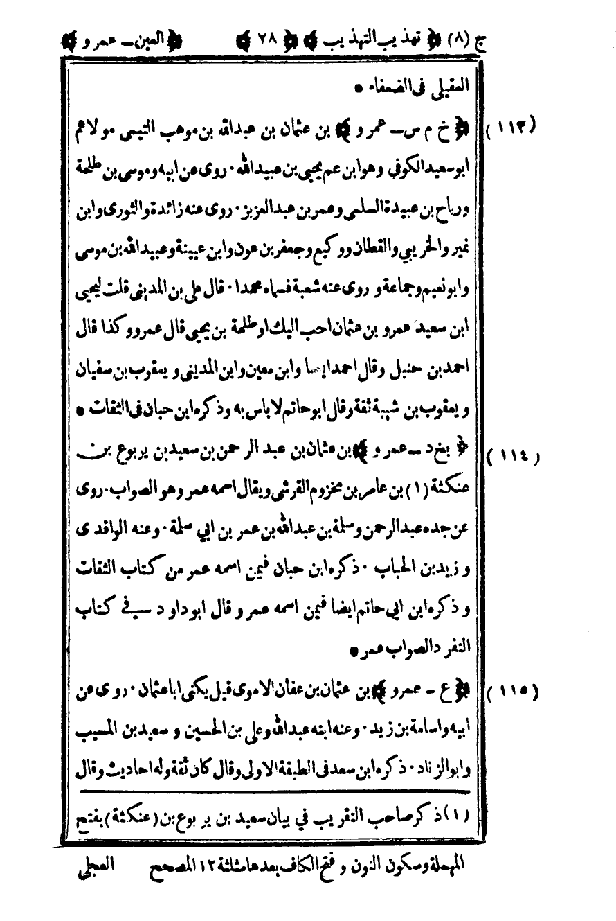 113- "خ م س – عمرو" بن عثمان بن عبد الله بن موهب التيمي مولاهم أبو سعيد الكوفي وهو بن عم يحيى بن عبيد الله روى عن أبيه وموسى بن طلحة ورباح بن عبيدة السلمي وعمر بن عبد العزيز روى عنه زائدة والثوري وابن نمير والخريبي والقطان ووكيع وجعفر بن عون وابن عيينة وعبيد الله بن موسى وأبو نعيم وجماعة وروى عنه شعبة فسماه محمدا قال علي بن المديني قلت ليحيى بن سعيد عمرو بن عثمان أحب إليك أو طلحة بن يحيى قال عمرو وكذا قال أحمد بن حنبل وقال أحمد أيضا وابن معين وابن المديني ويعقوب بن سفيان ويعقوب بن شيبة ثقة وقال أبو حاتم لا بأس به وذكره بن حبان في الثقات