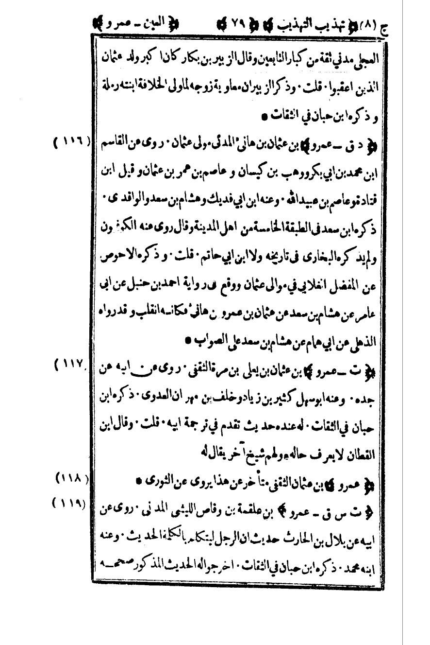 117- "ت الترمذي عمرو بن عثمان بن يعلى بن مرة الثقفي روى عن أبيه عن جده وعنه أبو سهل كثير بن زياد وخلف بن مهران العدوي ذكره بن حبان في الثقات له عنده حديث تقدم في ترجمة أبيه قلت وقال بن القطان لا يعرف حاله ولهم شيخ آخر يقال له