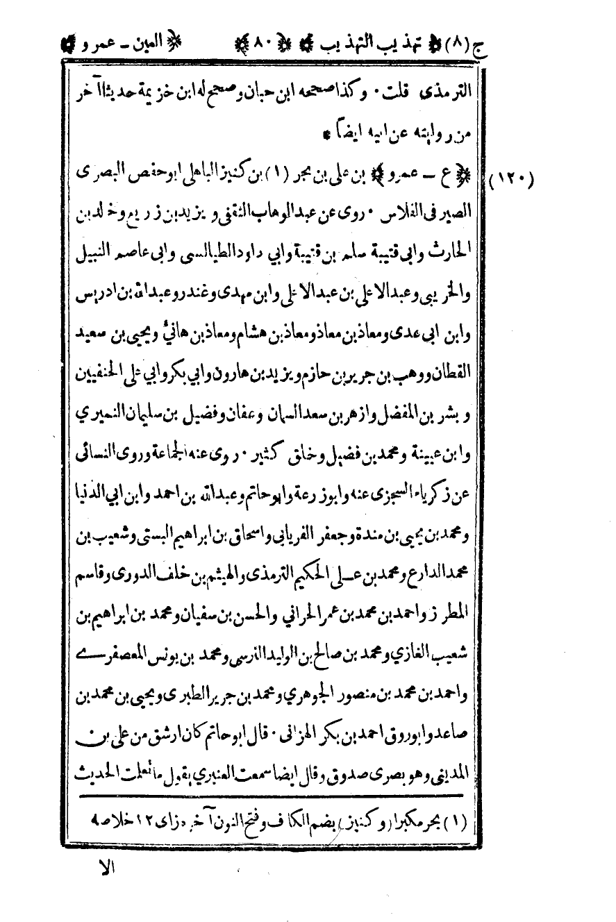 120- "ع – عمرو" بن علي بن بحر1 بن كنيز الباهلي أبو حفص البصري الصيرفي الفلاس روى عن عبد الوهاب الثقفي ويزيد بن زريع وخالد بن الحارث وأبي قتيبة سلم بن قتيبة وأبي داود الطيالسي وأبي عاصم النبيل والخريبي وعبد الأعلى بن عبد الأعلى وابن مهدي وغندر وعبد الله بن إدريس وابن أبي عدي ومعاذ بن معاذ ومعاذ بن هشام ومعاذ بن هانئ ويحيى بن سعيد القطان ووهب بن جرير بن حازم ويزيد بن هارون وأبي بكر وأبي على الحنفيين وبشر بن المفضل وأزهر بن سعد السمان وعفان وفضيل بن سليمان النميري وابن عيينة ومحمد بن فضيل وخلق كثير روى عنه الجماعة وروى النسائي عن زكريا السجزي عنه وأبو زرعة وأبو حاتم وعبد الله بن أحمد وابن أبي الدنيا ومحمد بن يحيى بن مندة وجعفر الفريابي وإسحاق بن إبراهيم البستي وشعيب بن محمد الدارع ومحمد بن علي الحكيم الترمذي والهيثم بن خلف الدروي وقاسم المطرز وأحمد بن محمد بن عمر الحراني والحسن بن سفيان ومحمد بن إبراهيم بن شعيب الغازي ومحمد بن صالح بن الوليد النرسي ومحمد بن يونس المعصفري وأحمد بن بن محمد بن منصور الجوهري ومحمد بن جرير الطبري ويحيى بن محمد بن صاعد وأبو روق أحمد بن كبر الهزاني قال أبو حاتم كان أرشق من علي بن المديني وهو بصري صدوق وقال أيضا سمعت العنبري يقول ما تعلمت الحديث