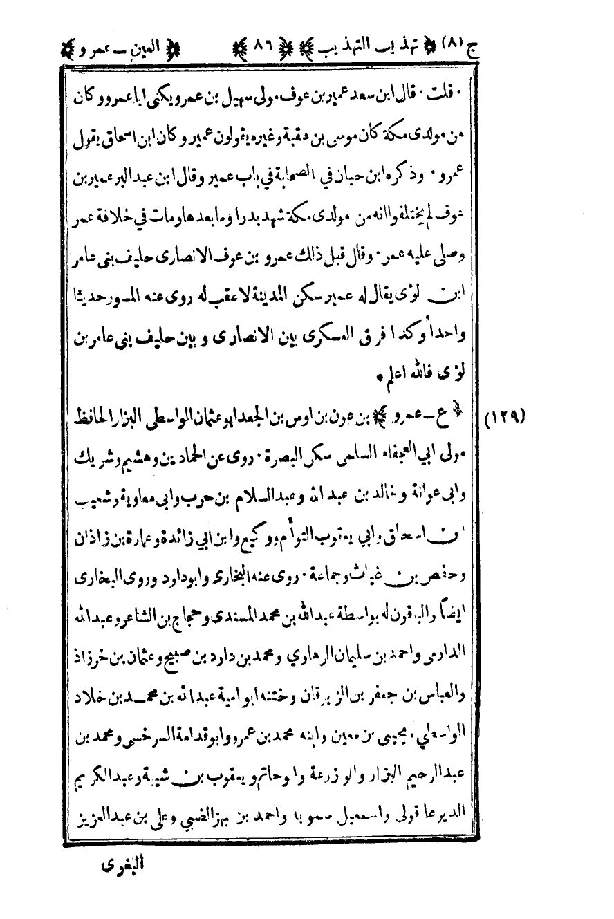 129- "ع – عمرو" بن عوف بن أوس بن الجعد أبو عثمان الواسطي البزار الحافظ مولى أبي العجفاء السلمي سكن البصرة روى عن الحمادين وهشيم وشريك وأبي عوانة وخالد بن عبد الله وعبد السلام بن حرب وأبي معاوية وشعيب بن إسحاق وأبي يعقوب التوأم ووكيع وابن أبي زائدة وعمارة بن زاذان وحفص بن غياث وجماعة روى عنه البخاري وأبو داود وروى البخاري أيضا والباقون له بواسطة عبد الله بن محمد المسندي وحجاج بن الشاعر وعبد الله الدارمي وأحمد بن سليمان الرهاوي ومحمد بن داود بن صبيح وعثمان بن خرزاذ والعباس بن جعفر بن الزبرقان وختنه أبو أمية عبد الله بن محمد بن خلاد الواسطي ويحيى بن معين وابنه محمد بن عمرو وأبو قدامة السرخسي ومحمد بن عبد الرحيم البزار وأبو زرعة وأبو حاتم ويعقوب بن شيبة وعبد الكريم الدير عاقولي وإسماعيل سمويه وأحمد بن بهز الضبي وعلي بن عبد العزيز