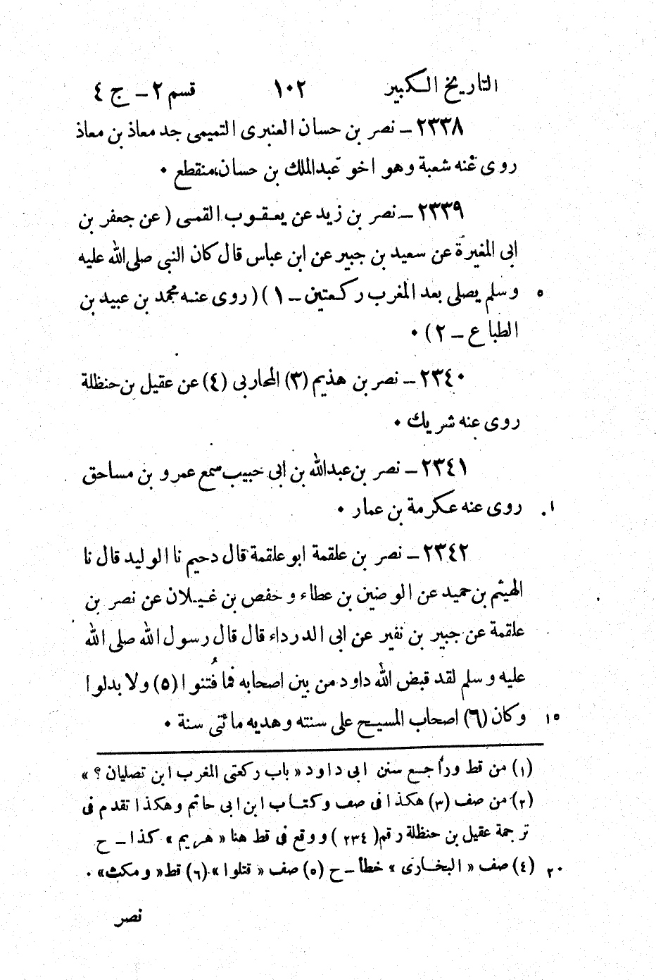 2339 - نصر بْن زيد عَنْ يعقوب القمي (عَنْ جَعْفَر بْن أَبِي المغيرة عَنْ سَعِيدِ بْنِ جُبَيْر عَنِ ابْنِ عَبَّاسٍ قَالَ كَانَ النَّبِيُّ صَلَّى اللَّهُ عَلَيْهِ وَسَلَّمَ يُصَلِّي بعد المغرب ركعتين - 1) (روى عنه مُحَمَّد بْن عُبَيْد بْن الطباع - 2) .
