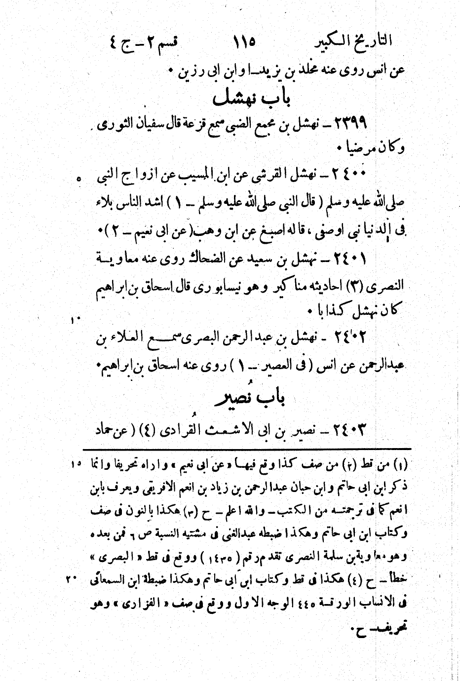 2402 - نهشل بْن عَبْد الرَّحْمَن الْبَصْرِيّ سَمِعَ العلاء بْن عَبْد الرَّحْمَن عَنْ أنس (فِي العصير - 1) روى عَنْهُ إِسْحَاق بْن إِبْرَاهِيم.