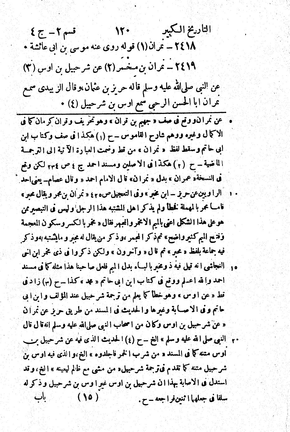 2419 - نمران بن مخمر (2) عن شر حبيل بْن أوس (3) عَنِ النَّبِيِّ صَلَّى اللَّهُ عَلَيْهِ وَسَلَّمَ قَالَه حريز بْن عثمان، وقَالَ الزبيدي سَمِعَ نمران أبا الْحَسَن الرحبي سَمِعَ أوس بن شر حبيل (4) .