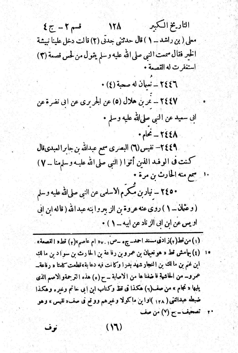 2449 - نفِيس (6) الْبَصْرِيّ سَمِعَ عَبْد اللَّه بْن جَابِر العبدي قَالَ كنت فِي الوفد الَّذِين أتوا (النَّبِيّ صَلَّى اللَّهُ عَلَيْهِ وَسَلَّمَ منا - 7) سَمِعَ منه الحارث بْن مرة.