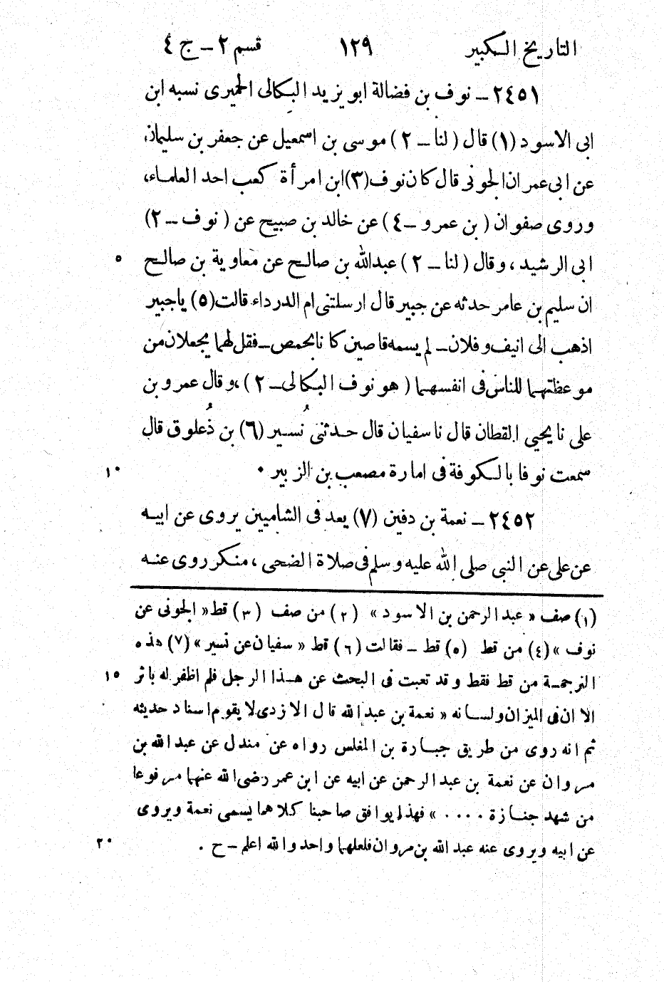 2451 - نوف بْن فضالة أَبُو يزيد البكالي الحميري نسبه ابْن أَبِي الأسود (1) قَالَ (لنا - 2) مُوسَى بن اسمعيل عَنْ جَعْفَر بْن سُلَيْمَان عَنْ أَبِي عمران الجوني قال كان نوف (3) ابن امرأة كعب أحد العلماء، وروى صفوان (بْن عمرو - 4) عَنْ خَالِد بْن صبيح عَنْ (نوف - 2) أَبِي الرشيد، وقَالَ (لَنَا - 2) عَبْد اللَّه بْن صَالِحٍ عَنْ مُعَاوية بْن صالح أن سليم بْن عامر حدثه عَنْ جُبَيْر قَالَ أرسلتني أم الدرداء قَالَت (5) يا جُبَيْر أذهب إلى أنيف وفلان - لم يسمه قاصين كَانَا بحمص - فقل لَهُما يجعلان من موعظتهما للناس فِي أنفسهما (هو نوف البكالي - 2) ، وقَالَ عمرو بْن علي نا يحيى القطان قَالَ نا سفيان قَالَ حدثني نسير (6) بْن ذعلوق قَالَ سمعت نوفا بالكوفة فِي إمارة مصعب بْن الزبير.