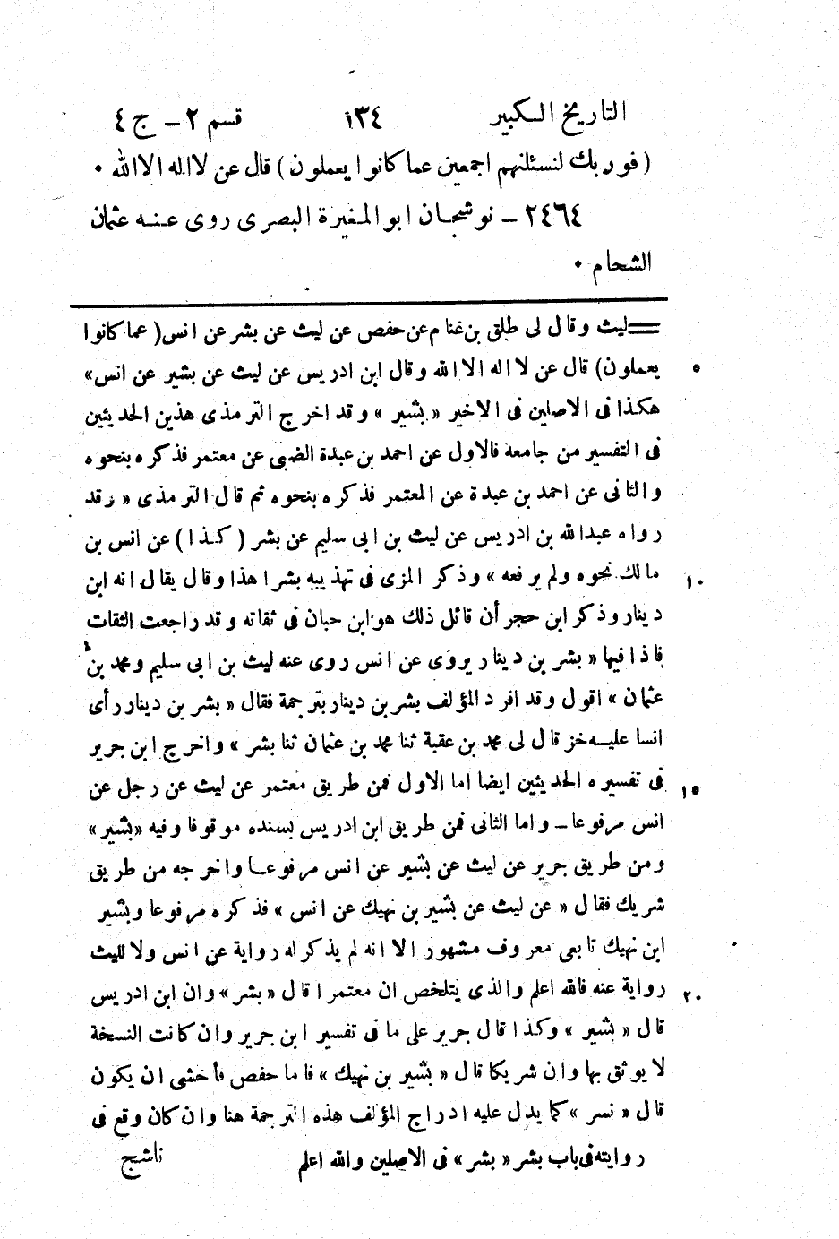 = لَيْثٍ وَقَالَ لِي طلق بْن غنام عَنْ حفص عَنْ ليث عَنْ بشر عَنْ أنس (عَمَّا كَانُوا يَعْمَلُونَ) قَالَ عَنْ لا إِلَهَ الا الله وقال ابن دريس عن ليث عن بشر عن أنس " هكذا في الاصلين في الاخير " بشير " وقد أخرج الترمذي هذين الحديثين في التفسير من جامعه فالاول عن احمد بن عبدة الضبي عن معتمر فذكره بنحوه والثاني عن أحمد بن عبدة عن المعتمر فذكره بنحوه ثم قال الترمذي " وقد رواه عبد الله بن ادريس عن ليث بن أبي سليم عن بشر (كذا) عن أنس بن مالك نحوه ولم يرفعه " وذكر المزي في تهذيبه بشرا هذا وقال يقال انه ابن دينار وذكر ابن حجر أن قائل ذلك هو ابن حبان في ثقاته وقد راجعت الثقات فإذا فيها " بشر بن دينار يروى عن أنس روى عنه ليث بن أبي سليم ومحمد بن عثمان " أقول وقد أفرد المؤلف بشر بن دينار بترجمة فقال " بشر بن دينار رأى انسا عليه خز قال لي محمد بن عقبة ثنا محمد بن عثمان ثنا بشر " وأخرج ابن جرير في تفسيره الحديثين أيضا اما الاول فمن طريق معتمر عن ليث عن رجل عن انس مرفوعا - وأما الثاني فمن طريق ابن ادريس بسنده موقوفا وفيه " بشير "