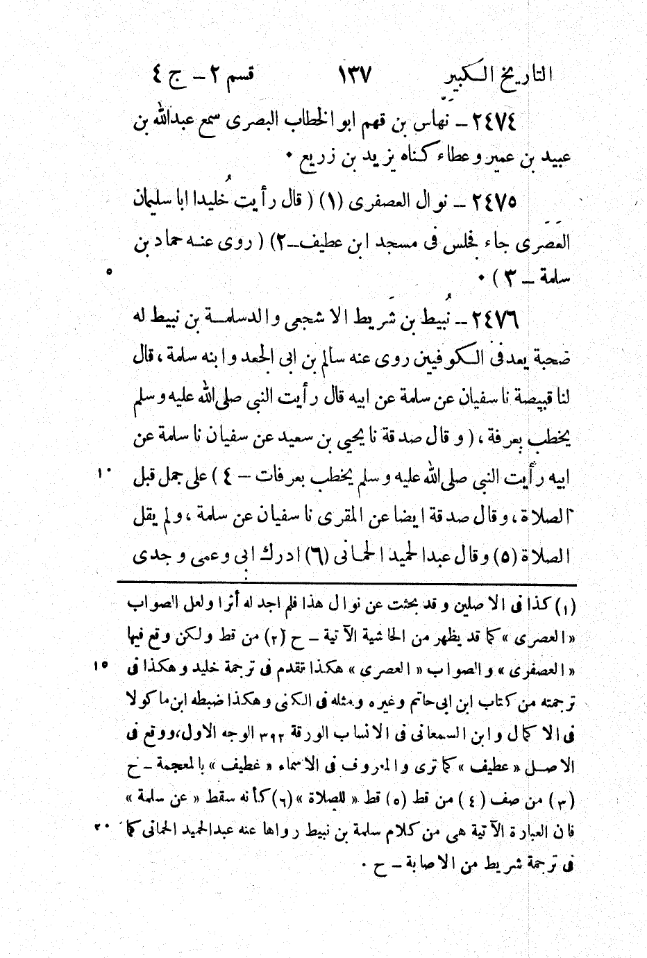 (1) كذا في الاصلين وقد بحثت عن نوال هذا فلم أجد له أثرا ولعل الصواب " العصري " كما قد يظهر من الحاشية الآتية - ح (2) من قط ولكن وقع فيها " العصفري " والصواب " العصري " هكذا تقدم في ترجمة خليد وهكذا في ترجمته من كتاب ابن أبي حاتم وغيره ومثله في الكنى وهكذا ضبطه ابن مأكولا في الاكمال وابن السمعاني في الانساب الورقة 392 الوجه الاول، ووقع في الاصل " عطيف " كما ترى والمعروف في الاسماء " غطيف " بالمعجمة - ح (3) من صف (4) من قط (5) قط " للصلاة " (6) كأنه سقط " عن سلمة " فان العبارة الآتية هي من كلام سلمة بن نبيط رواها عنه عبد الحميد الحماني كما في ترجمة شرايط من الاصابة - ح.