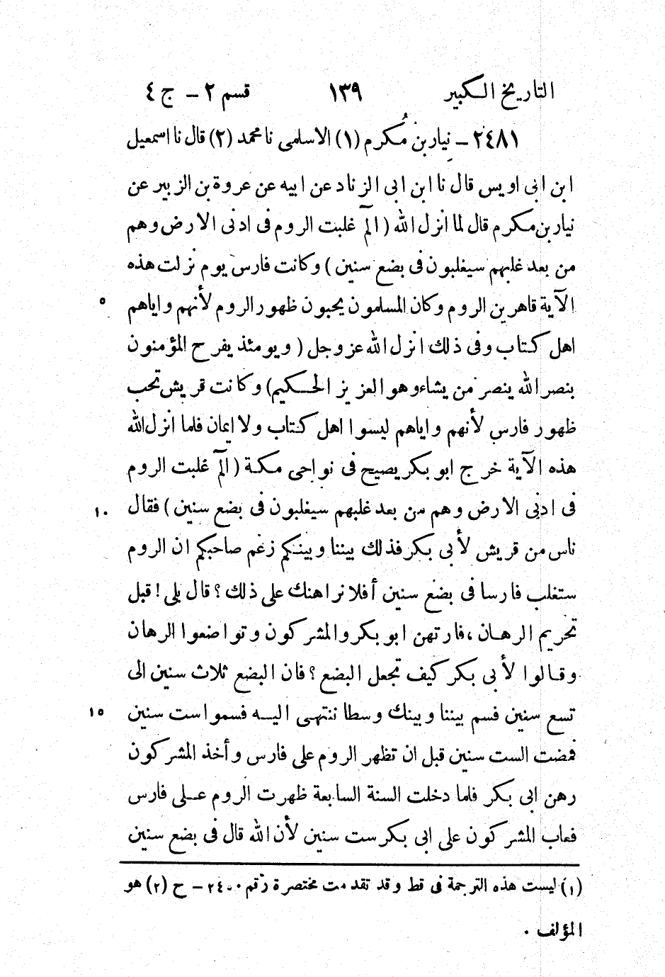 2481 - نيار بْن مكرم (1) الأسلمي نا مُحَمَّد (2) قَالَ نا اسمعيل ابن أَبِي أُوَيْسٍ قَالَ نا ابْن أَبِي الزِّنَادِ عَنْ أَبِيه عَنْ عروة بْن الزبير عَنْ نِيَارِ بْنِ مُكْرَمٍ قَالَ لَمَّا أَنْزَلَ اللَّهُ (الم غُلِبَتِ الرُّومُ فِي أَدْنَى الأَرْضِ وَهُمْ مِنْ بَعْدِ غَلَبِهِمْ سَيَغْلِبُونَ فِي بِضْعِ سِنِينَ) وكَانَت فَارِسُ يَوْمَ نَزَلَتْ هَذِهِ الآيَةُ قَاهِرِينَ الرُّومَ وَكَانَ المُسْلِمونَ يُحِبُّونَ ظُهُورَ الرُّومِ لأَنَّهُمْ واياهم أهل الكتاب وفي ذلك أنزل الله عزوجل (وَيَوْمَئِذٍ يَفْرَحُ الْمُؤْمِنُونَ بِنَصْرِ اللَّهِ يَنْصُرُ مَنْ يشاء وهو العزيز الحكمى) وَكَانَتْ قُرَيْشٌ تُحِبُّ ظُهُورَ فَارِسَ لأَنَّهُمْ وَإِيَّاهُمْ لَيْسُوا أَهْلَ كِتَابٍ وَلا إِيمَانٍ فَلَمَّا أَنْزَلَ اللَّهُ هَذِهِ الآيَةَ خَرَجَ أَبُو بَكْرٍ يَصِيحُ فِي نَوَاحِي مَكَّةَ (الم غُلِبَتِ الرُّومُ فِي أَدْنَى الأَرْضِ وَهُمْ مِنْ بَعْدِ غَلَبِهِمْ سَيَغْلِبُونَ في بضع سنين (فقَالَ ناس من قريش لأَبِي بكر فَذَلِكَ بينا وَبَيْنَكُمْ زَعَمَ صَاحِبُكُمْ أَنَّ الرُّومَ