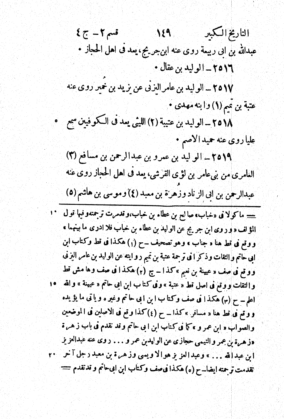2519 - الوليد بْن عمرو بْن عَبْد الرَّحْمَن بْن مسافع (3) العامري من بني عامر بْن لؤي الْقُرَشِيّ، يعد فِي أهل الحجاز روى عَنْهُ عَبْد الرَّحْمَن بْن أَبِي الزناد وزهرة بْن معبد (4) ومُوسَى بْن هاشم (5)
