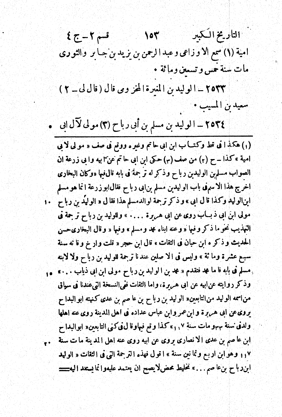 2534 - الوليد بْن مُسْلِم بن أبي رباح (3) مولى لآل أبي * هامش * (1) هكذا في قط وكتاب ابن أبي حاتم وغيره ووقع في صف " مولي لابي امية " كذا - ح (2) من صف (3) حكى ابن أبي حاتم عن أبيه وأبي زرعة ان الصواب مسلم بن الوليد بن رباح وذكر له ترجمة في بابه قال فيها " وكان البخاري أخرج هذا الاسم في باب الوليد بن مسلم بن أبي رباح فقال أبو زرعة انما هو مسلم ابن الوليد وكذا قال أبي " وذكر ترجمة لوالد مسلم هذا فقال " الوليد بْن رباح مولى ابْن أَبِي ذباب روى عن أبي هريرة ... " وللوليد بن رباح ترجمة في التهذيب نحو ما ذكر وفيها " وعنه ابناه محمد ومسلم " وفيها " وقال البخاري حسن الحديث وذكره ابن حبان في الثقات " قال ابن حجر " قلت وأرخ وفاته سنة سبع عشرة ومائة " وليس في الاصلين عندنا ترجمة للوليد بن رباح ولا لابنه مسلم في بابه فأما محمد فتقدم " مُحَمَّد بْن الوليد بْن رباح مولى ابْن أبي ذباب ... " وذكر روايته عن أبيه عن أبي هريرة، وأما الثقات ففي النسخة التي عندنا في سياق من اسمه الوليد من التابعين " الوليد بن رباح بن عاصم بن عدي كنيته أبو البداح يروي عن أبي هريرة وابن عمرو ابن عباس عداده في أهل المدينة روى عنه أهلها ولد في سنة 33 ومات سنة 117 " كذا وقع فيها وقال في كنى التابعين " أبو البداح ابن عاصم بن عدي الانصاري يروي عن أبيه روى عنه أهل المدينة مات سنة 117 وهو ابن أربع وثمانين سنة " أقول فهذه الترجمة التي في الثقات " الوليد ابن رباح بن عاصم ... " تخليط محض لا يصح أن يعتمد عليه وانما يستند إليه = (*)