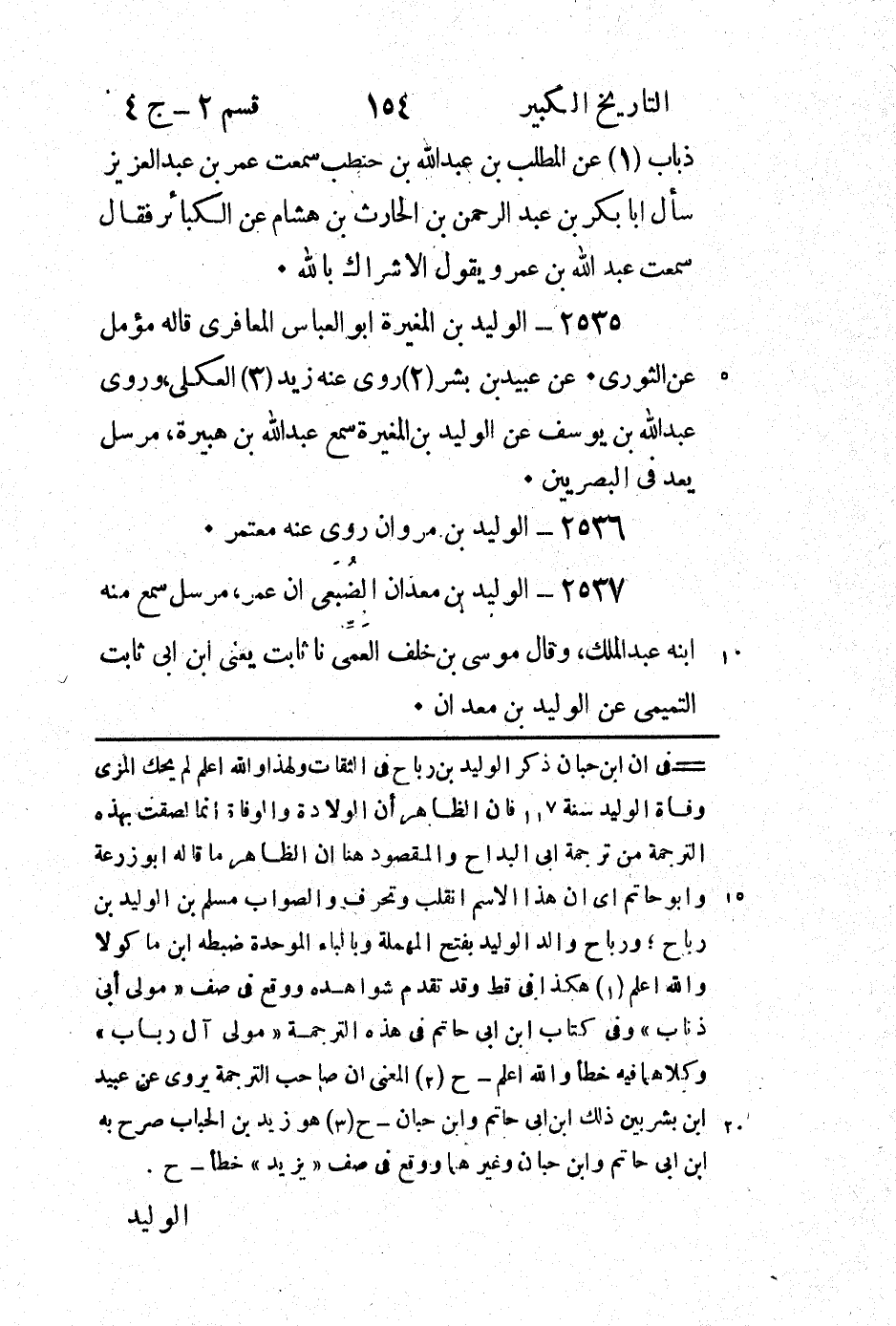 = في ان حبان ذكر الوليد بن رباح في الثقات ولهذا والله أعلم لم يحك المزي وفاة الوليد سنة 117 فان الظاهر أن الولادة والوفاة انما لصقت بهذه الترجمة من ترجمة أبي البداح والمقصود هنا ان الظاهر ما قاله أبو زرعة وأبو حاتم أي ان هذا الاسم انقلب وتحرف والصواب مسلم بن الوليد بن رباح، ورباح والد الوليد بفتح المهملة وبالباء الموحدة ضبطه ابن مأكولا والله أعلم (1) هكذا في قط وقد تقدم شواهده ووقع في صف " مولى أبي ذناب " وفي كتاب ابن أبي حاتم في هذه الترجمة " مولى آل رباب، وكلاهما فيه خطأ والله أعلم - ح (2) المعنى أن صاحب الترجمة يروي عن عبيد ابن بشر بين ذلك ابن أبي حاتم وابن حبان - ح (3) هو زيد بن الحباب صرح به ابن أبي حاتم وابن حبان وغيرهما ووقع في صف " يزيد " خطأ - ح.