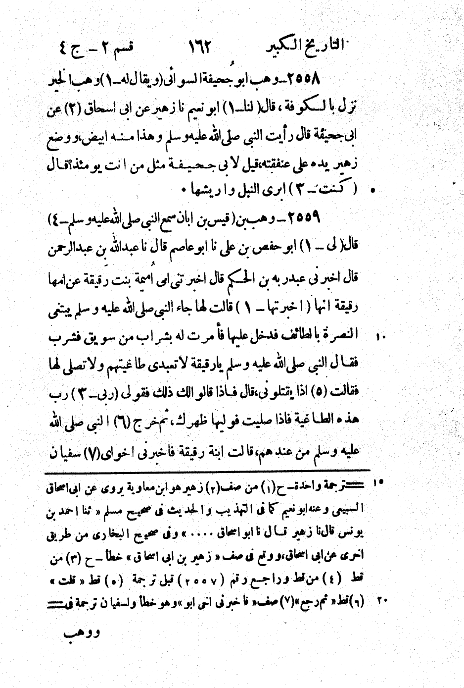 2558 - وهب أَبُو جحيفة السوائي (ويقال لَهُ - 1) وهب الخير نزل بالكوفة، قَالَ (لنا - 1) أَبُو نعيم نا زهير عَنْ أَبِي إِسْحَاق (2) عَنْ أَبِي جحيفة قَالَ رَأَيْتُ النَّبِيَّ صَلَّى اللَّهُ عَلَيْهِ وَسَلَّمَ وهذا منه أَبِيض، ووضع زهير يده على عَنْفقته، قِيلَ لأَبِي جحيفة مثل من أنت يومئذ؟ قَالَ (كنت - 3) أبري النبل وأريشها.