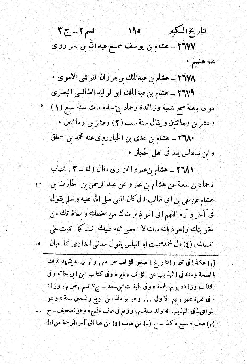 2681 - هِشَامُ بْنُ عمر الْفَزَارِيُّ، قَالَ (لَنَا - 3) شِهَابٌ نَا حَمَّادُ بْنُ سَلَمَةَ عَنْ هِشَامِ بْنِ عَمْرٍو عَنْ عَبْد الرَّحْمَن بْن الْحَارِثِ بْن هِشَامٍ عَنْ عَلِيِّ بْنِ أَبِي طَالِبٍ قَالَ كَانَ النَّبِيُّ صَلَّى اللَّهُ عَلَيْهِ وَسَلَّمَ يَقُولُ فِي آخِرِ وِتْرِهِ اللهم اني اعوذ برضاك من سخطك وبمعا فاتك مِنْ عُقُوبَتِكَ وَأَعُوذُ بِكَ مِنْكَ لا أُحْصِي ثَنَاءً عَلَيْكَ أَنْتَ كَمَا أَثْنَيْتَ عَلَى نَفْسِكَ، (4) قَالَ مُحَمَّدٌ سَمِعْتُ أَبَا الْعَبَّاسِ يَقُولُ حَدَّثَنِي الدارمي ثنا حبان