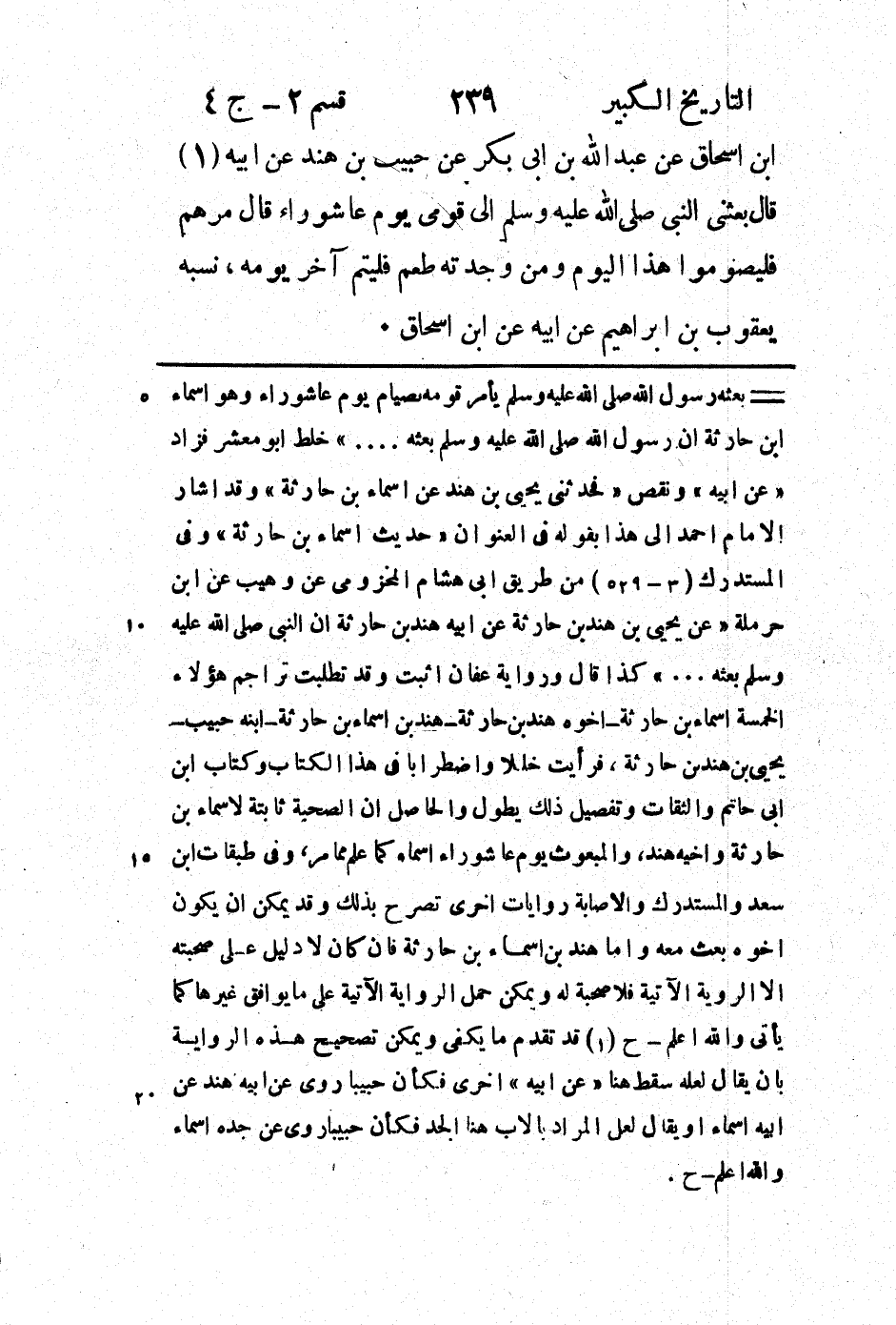 3 - 529) من طريق ابى هشام المخزومى عن وهيب عن ابن حرملة " عن يحيى بن هند بن حارثة عن ابيه هند بن حارثة ان النبي صلى الله عليه وسلم بعثه.." كذا قال ورواية عفان اثبت وقد تطلبت تراجم هؤلاء الخمسة اسماء بن حارثة - اخوه هند بن حارثة - هند بن اسماء بن حارثة - ابنه حبيب - يحيى بن هند بن حارثة، فرأيت خللا واضطرابا في هذا الكتاب وكتاب ابن ابى حاتم والثقات وتفصيل ذلك يطول والحاصل ان الصحبة ثابتة لاسماء بن حارثة واخيه هند، والمبعوث يوم عاشوراء اسماء كما علم مما مر، وفي طبقات ابن سعد والمستدرك والاصابة روايات اخرى تصرح بذلك وقد يمكن ان يكون اخوه بعث معه واما هند بن اسماء بن حارثة فان كان لا دليل على صحبته الا الرواية الآتية فلا صحبتة له ويمكن حمل الرواية الآتية على ما يوافق غيرها كما يأتي والله اعلم - ح (1) قد تقدم ما يكفى ويمكن تصحيح هذه الرواية بان يقال لعله سقط هنا " عن ابيه " اخرى فكأن حبيبا روى عن ابيه هند عن ابيه اسماءا ويقال لعل المراد بالاب هنا الجد فكأن حبيبا روى عن جده اسماء والله اعلم - ح.