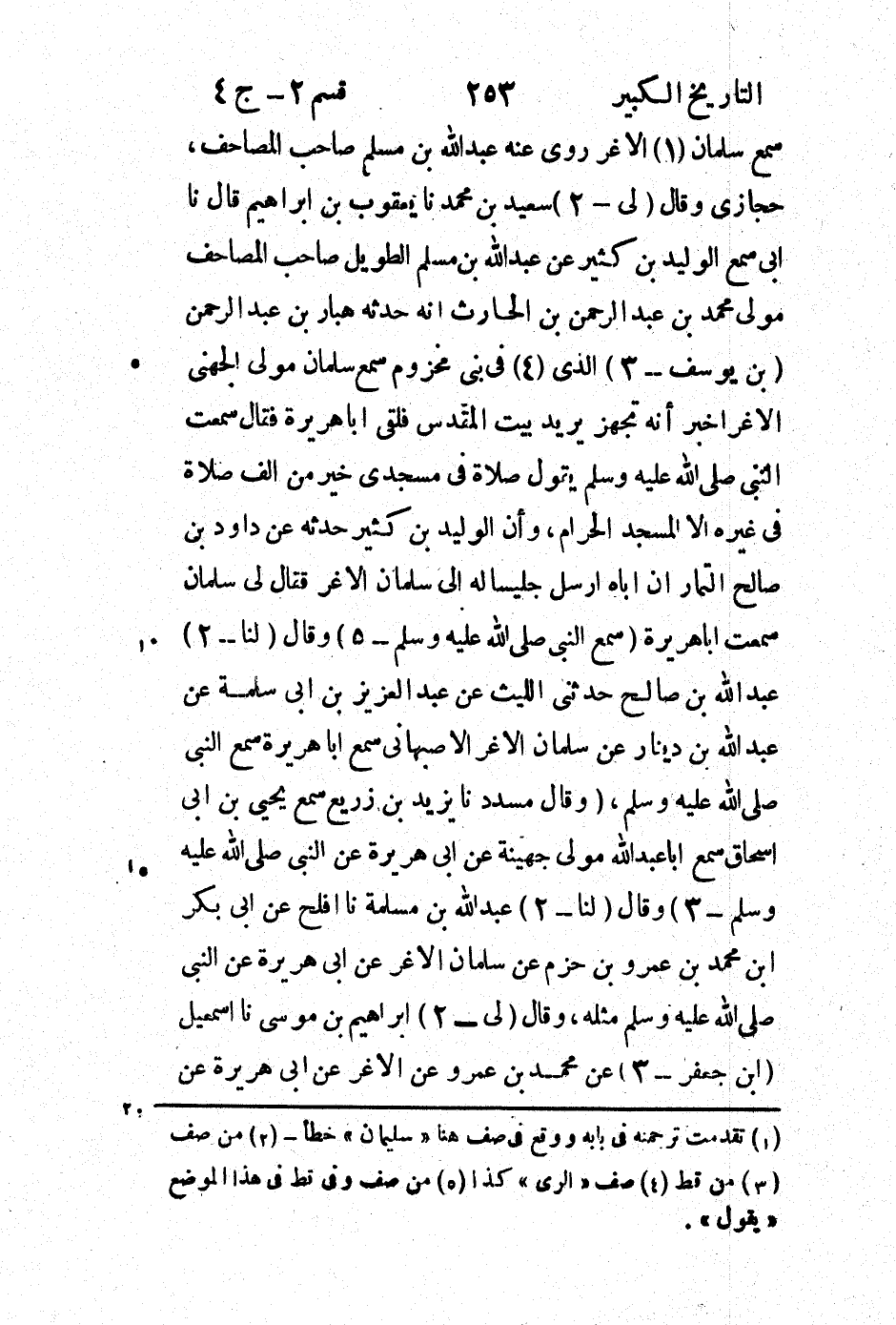 سَمِعَ سَلْمَانَ (1) الأَغَرَّ رَوَى عَنْهُ عَبْدُ اللَّهِ بن مسلم صاحب المصاحب، حِجَازِيٌّ وَقَالَ (لِي - 2) سَعِيد بْن مُحَمَّد نَا يَعْقُوبُ بْن إِبْرَاهِيم قَالَ نَا أَبِي سَمِعَ الْوَلِيدَ بْن كَثِيرٍ عَنْ عَبْد اللَّه بْن مُسْلِمٍ الطَّوِيلِ صَاحِبِ الْمَصَاحِفِ مَوْلَى مُحَمَّد بْن عَبْد الرَّحْمَن بْن الْحَارِثِ أَنَّهُ حَدَّثَهُ هَبَّارُ بْنُ عَبْدِ الرَّحْمَنِ (بْنِ يُوسُفَ - 3) الَّذِي (4) فِي بَنِي مَخْزُومٍ سَمِعَ سَلْمَانَ مَوْلَى الْجُهَنِيِّ الأَغَرِّ أَخْبَرَ أَنَّهُ تَجَهَّزَ يُرِيدُ بَيْتَ الْمَقْدِسِ فَلَقَى أَبَا هُرَيْرَةَ فَقَالَ سَمِعْتُ النَّبِيّ صَلَّى اللَّهُ عَلَيْهِ وَسَلَّمَ يَقُولُ صَلاةٌ فِي مَسْجِدِي خَيْرٌ مِنْ أَلْفِ صَلاةٍ فِي غَيْرِهِ إِلا الْمَسْجِدَ الْحَرَامَ، وَإِنَّ الْوَلِيدَ بْنَ كَثِيرٍ حَدَّثَهُ عَنْ دَاوُدَ بْنِ صَالِحٍ التَّمَّارِ أَنَّ أَبَاهُ أَرْسَلَ جَلِيسًا لَهُ إِلَى سَلْمَانَ الأَغَرِّ فَقَالَ لِي سَلْمَانُ سَمِعْتُ أَبَا هُرَيْرَةَ (سَمِعَ النَّبِيّ صَلَّى اللَّهُ عَلَيْهِ وَسَلَّمَ - 5) وَقَالَ (لَنَا - 2) عَبْدُ اللَّهِ بْنُ صَالِحٍ حَدَّثَنِي اللَّيْثُ عَنْ عَبْد العزيز بْن أَبِي سلمة عَنْ عَبْد اللَّه بْن دينار عَنْ سلمان الأغر الأصبهاني سَمِعَ أَبَا هُرَيْرَةَ سَمِعَ النَّبِيّ