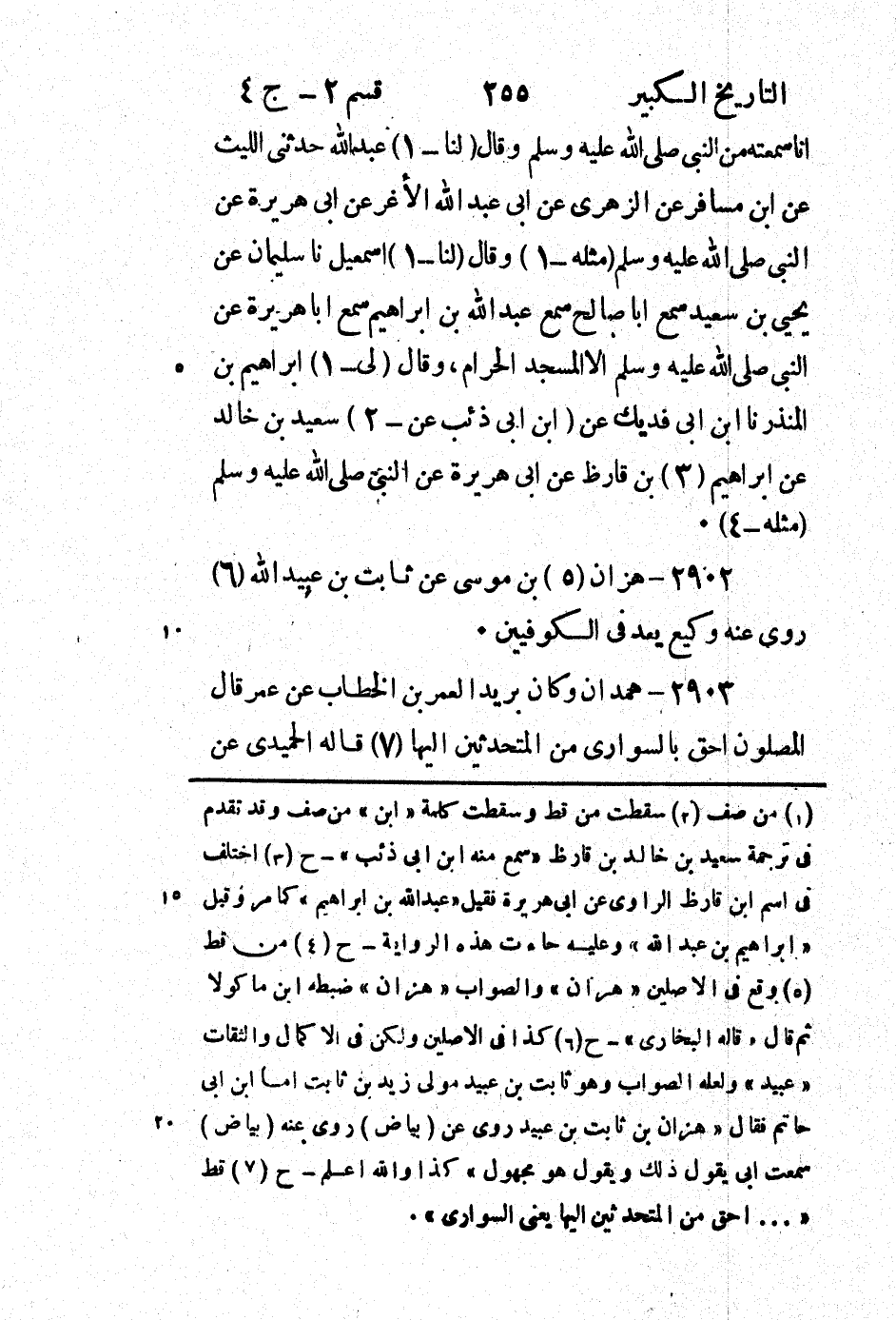 في ترجمة سعيد بن خالد بن قارظ " سمع منه ابن ابى ذئب " - ح (3) اختلف في اسم ابن قارظ الراوى عن ابى هريرة فقيل " عبد الله بن ابراهيم " كما مر وقبل " ابراهيم بن عبد الله " وعليه جاءت هذه الرواية - ح (4) من قط (5) وقع في الاصلين " هران " والصواب " هزان " ضبطه ابن ماكولا ثم قال " قاله البخاري " - ح (6) كذا في الاصلين ولكن في الاكمال والثقات " عبيد " ولعله الصواب وهو ثابت بْن عُبَيْد مولى زيد بْن ثابت اما ابن ابى حاتم فقال " هزان بن ثابت بن عبيد روى عن (بياض) روى عنه (بياض) سمعت ابى يقول ذلك ويقول هو مجهول " كذا والله اعلم - ح (7) قط "..احق من المتحدثين إليها يعنى السوارى ".