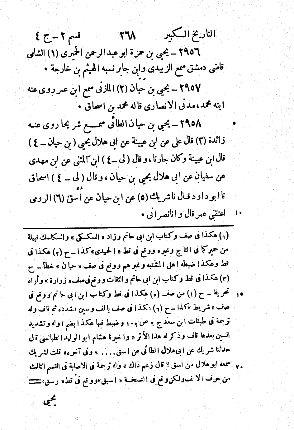 2958 - يحيى بْن حيان الطائي سَمِعَ شريحا روى عَنْهُ زائدة (3) قَالَ علي عَنِ ابْنِ عيينة عَنْ أَبِي هلال يحيى (بْن حيان - 4) قَالَ ابْن عيينة وكَانَ جارنا، وقَالَ (لي - 4) ابْن المثنى عَنِ ابْنِ مهدي عَنْ سفيان عَنْ أَبِي هلال يحيى بْن حيان، وقَالَ (لي - 4) إِسْحَاق نا أَبُو دَاوُد قَالَ نا شريك (5) عَنِ ابْنِ حيان عَنْ أسق (6) الرومي أعتقني عمر قال وانا نصراني.