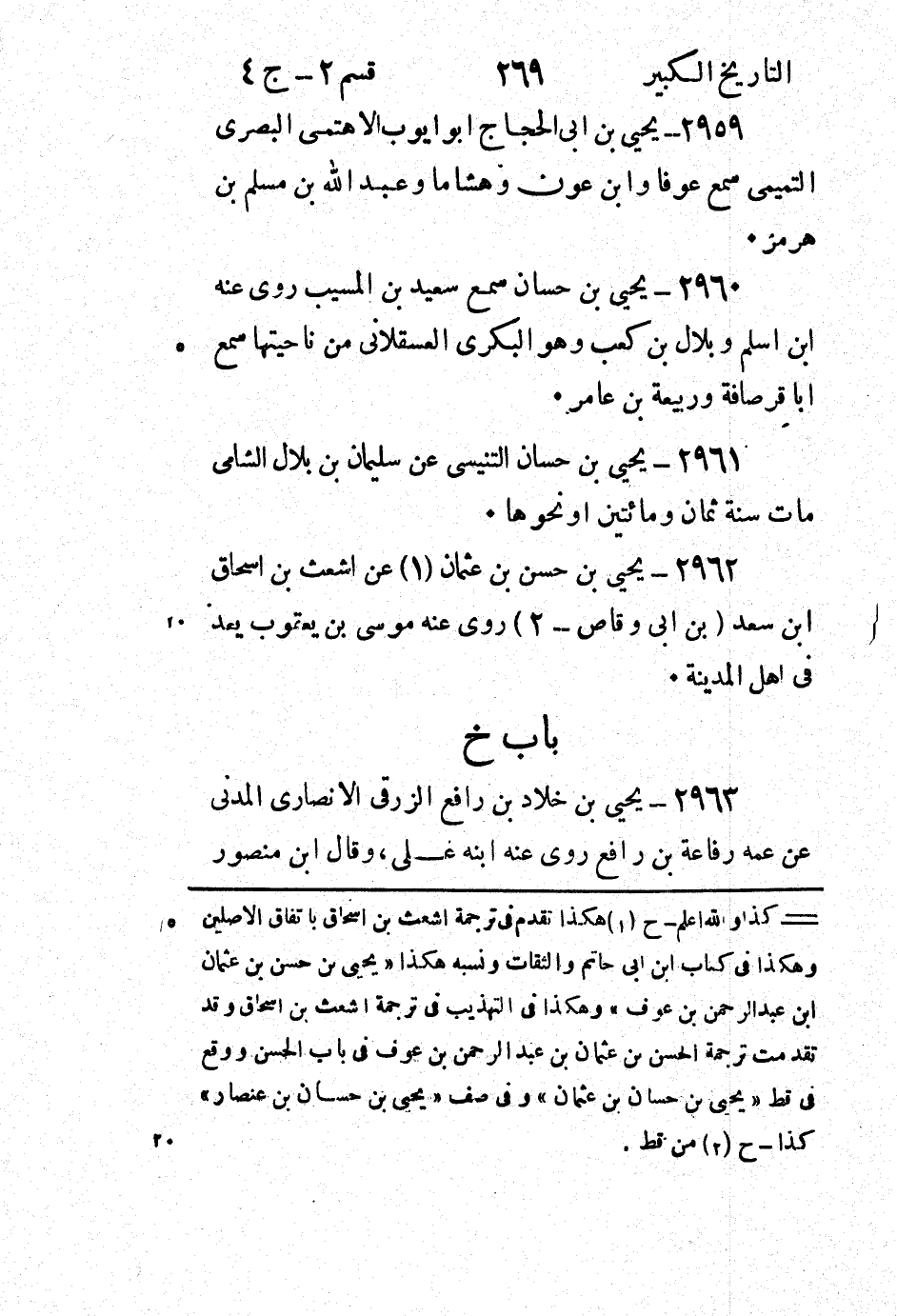 2963 - يَحْيَى بْن خَلادِ بْن رَافِعٍ الزَّرْقِيُّ الْأَنْصَارِيّ الْمَدَنِيُّ عَنْ عمه رفاعة بْن رافع روى عَنْهُ ابنه علي، وَقَالَ ابْنُ مَنْصُورٍ