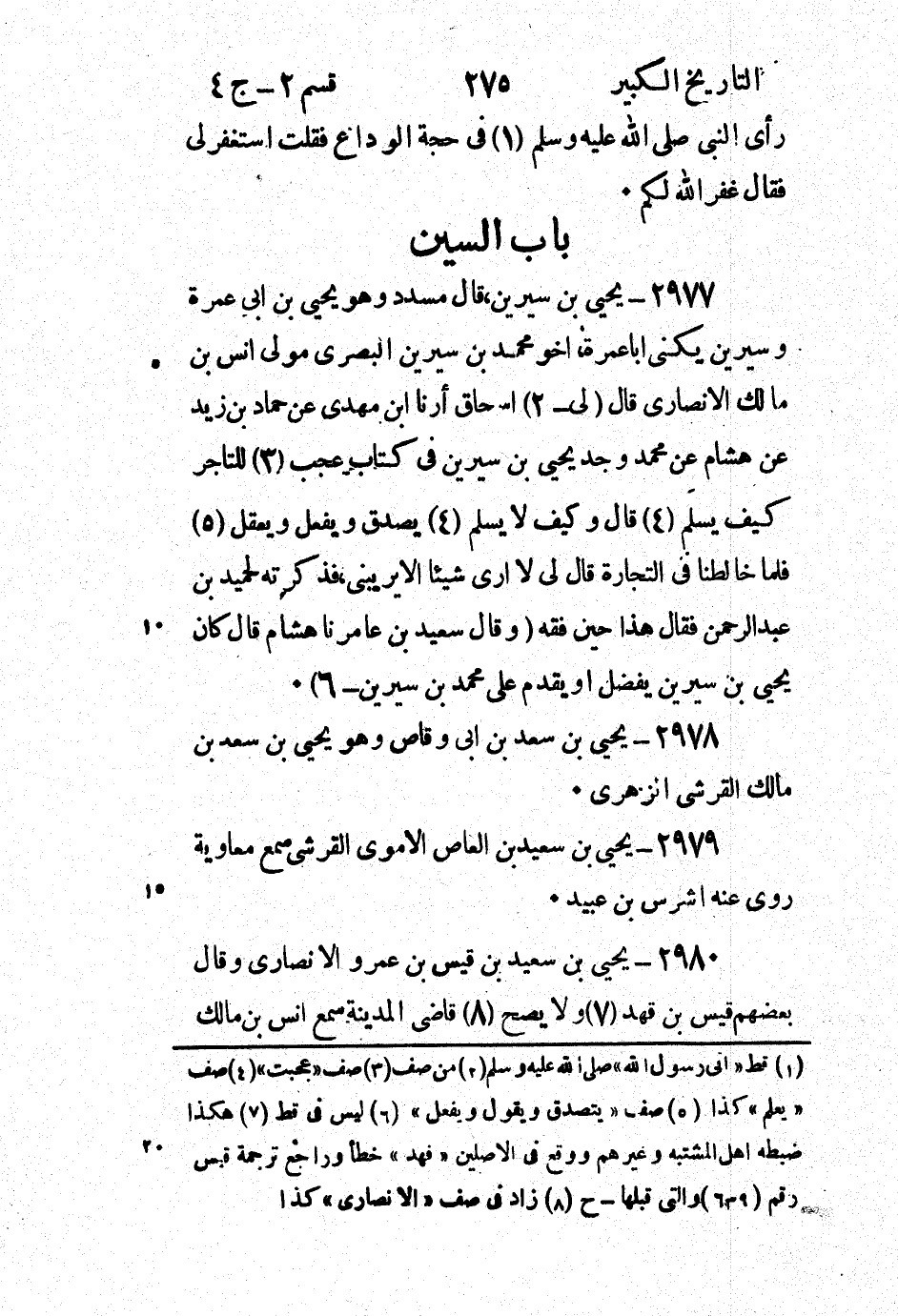 2977 - يحيى بْن سيرين، قَالَ مسدد وهو يحيى بْن أَبِي عُمَرة وسيرين يكنى أبا عُمَرة، أخو مُحَمَّد بْن سيرين الْبَصْرِيّ مولى أنس بْن مالك الْأَنْصَارِيّ قال (لى - 2) اسحاق أرنا ابْن مهدي عَنْ حماد بْن زيد عَنْ هشام بن مُحَمَّد وجد يحيى بْن سيرين فِي كتاب عجب (3) للتاجر كيف يسلم قَالَ وكيف لا يسلم (4) يصدق ويفعل ويعقل (5) فلما خالطنا فِي التجارة قال في لا ارى شيئا الايريبنى، فذكرته لحميد بْن عَبْد الرَّحْمَن فقَالَ هذا حين فقه (وقَالَ سَعِيد بْن عامر نا هشام قَالَ كَانَ يحيى بْن سيرين يفضل أو يقدم على مُحَمَّد بْن سيرين - 6) .