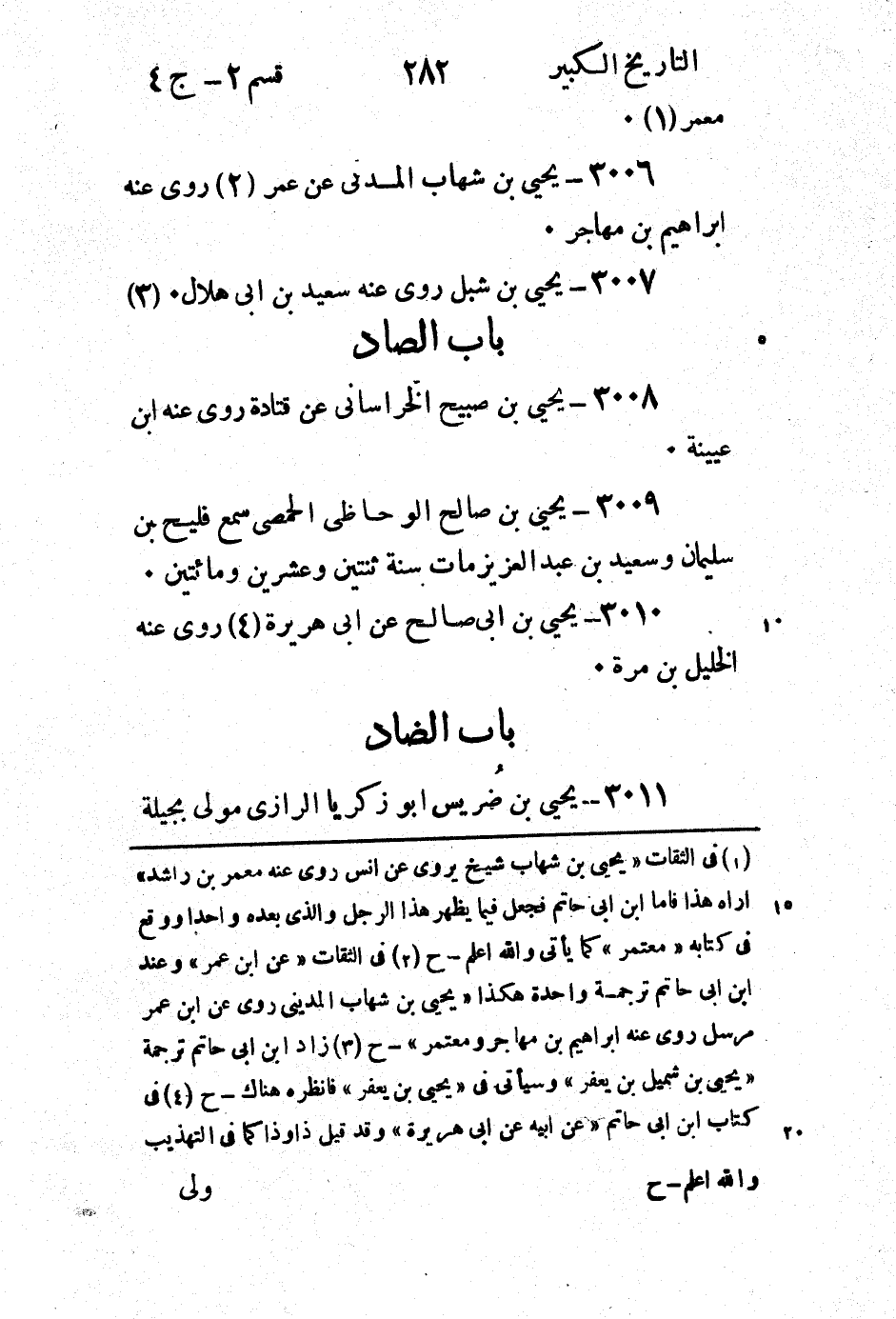 3011 - يحيى بْن ضريس أَبُو زكريا الرازي مولى بجيلة (* هامش) * (1) في الثقات " يحيى بن شهاب شيخ يروى عن انس روى عنه معمر بن راشد " اراه هذا فاما ابن أبي حاتم فجعل فيما يظهر هذا الرجل والذى بعده واحدا ووقع في كتابه " معتمر " كما يأتي والله اعلم - ح (2) في الثقات " عن ابن عمر " وعند ابن أبي حاتم ترجمة واحدة هكذا " يحيى بن شهاب المدينى روى عن ابن عمر مرسل روى عنه ابراهيم بن مهاجر ومعتمر " - ح (3) زاد ابن أبي حاتم ترجمة " يحيى بن شميل بن يعفر " وسيأتي في " يحيى بن يعفر " فانظره هناك - ح (4) في كتاب ابن أبي حاتم " عن ابيه عن أبي هريرة " وقد قيل ذاوذا كما في التهذيب والله اعلم - ح (*)