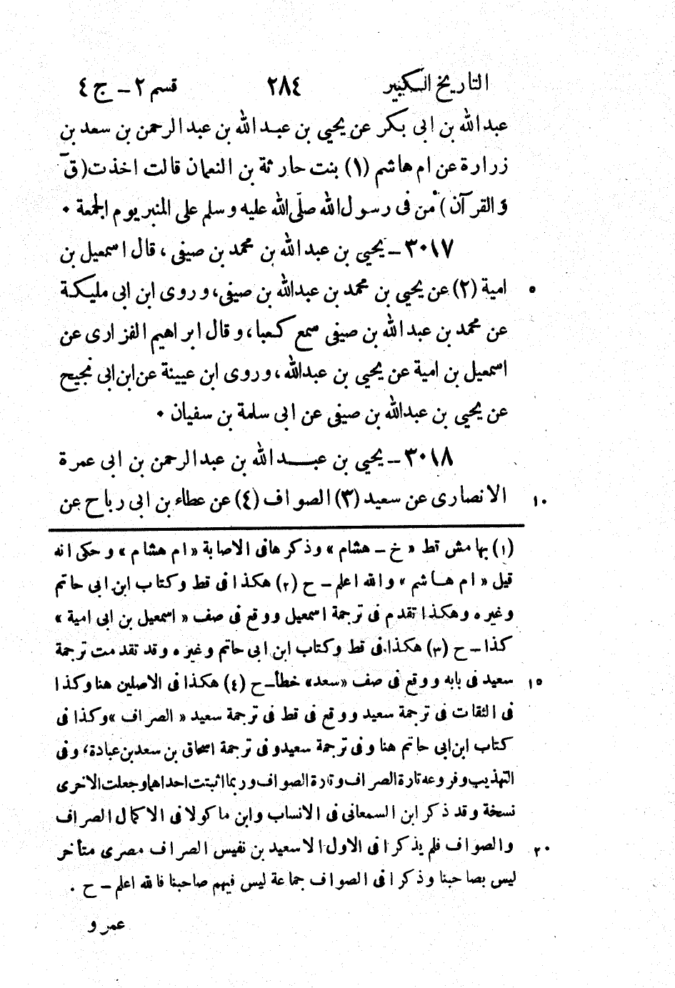 (1) بهامش قط " خ - هشام " وذكرها في الاصابة " ام هشام " وحكى انه قيل " ام هاشم " والله اعلم - ح (2) هكذا في قط وكتاب ابن أبي حاتم وغيره وهكذا تقدم في ترجمة اسمعيل ووقع في صف " اسمعيل بن أبي أمية " كذا - ح (3) هكذا في وكتاب ابن أبي حاتم وغيره وقد تقدمت ترجمة سعيد في بابه ووقع في صف " سعد " خطأ - ح (4) هكذا في الاصلين هنا وكذا في الثقات في ترجمة سعيد ووقع في قط في ترجمة سعيد " الصراف " وكذا في كتاب ابن ابي حاتم هنا وفي ترجمة سعيد وفي ترجمة اسحاق بن سعد بن عبادة، وفي التهذيب وفروعة تارة الصراف وتارة الصواف وربما اثبتت احداهما وجعلت الاخرى نسخة وقد ذكر ابن السمعاني في الانساب وابن ماكولا في الاكمال الصراف والصواف فلم يذكرا في الاول الا سعيد بن نفيس الصراف مصرى متأخر ليس بصاحبنا وذكرا في الصواف جماعة ليس فيهم صاحبنا فالله اعلم - ح.