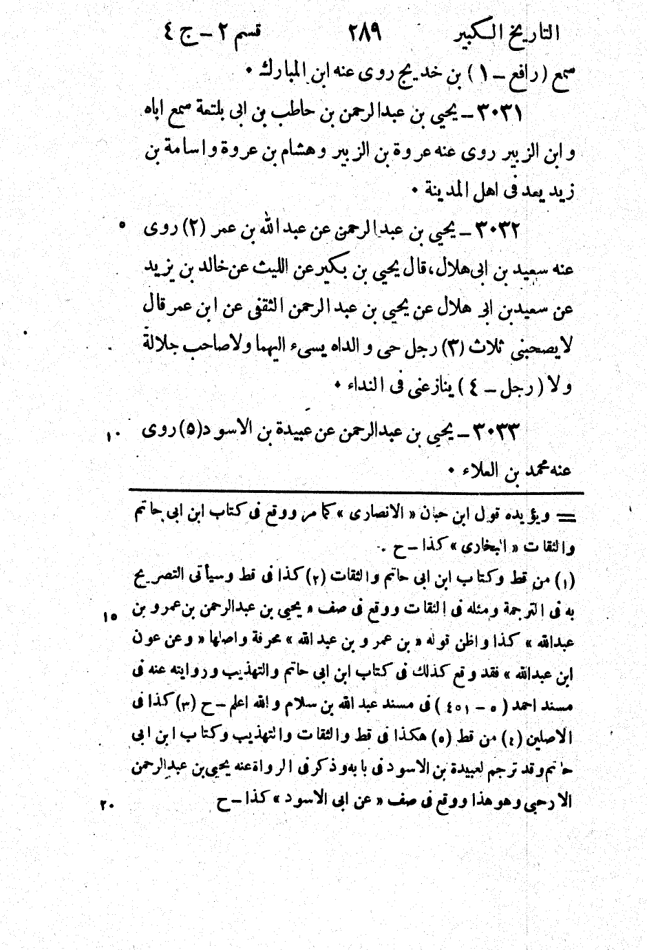 3031 - يحيى بْن عَبْد الرَّحْمَن بْن حاطب بْن أَبِي بلتعة سَمِعَ أباه وابْن الزبير روى عَنْهُ عروة بْن الزبير وهشام بْن عروة وأسامة بْن زيد يعد فِي أهل المدينة.