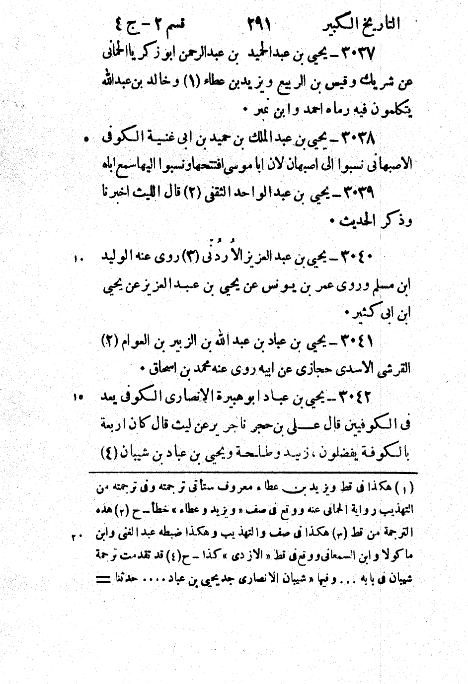 3042 - يحيى بْن عباد أَبُو هبيرة الْأَنْصَارِيّ الكوفِي يعد فِي الكوفِيين قَالَ علي بْن حجر نا جرير عَنْ ليث قَالَ كَانَ اربعة بالكوفة يفضلون، زيد وطلحة ويحيى بن عباد بن شيبان (4)