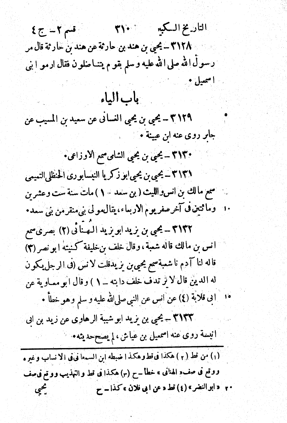 3132 - يحيى بْن يزيد أَبُو يزيد الهنائي (2) بصري سَمِعَ أنس بْن مالك قَالَهُ شُعْبَة، وقَالَ خلف بْن خليفة كنيته أَبُو نصر (3) قَالَهُ لنا آدم نا شُعْبَة سَمِعَ يحيى بْن يزيد قلت لأنس (فِي الرجل يكون لَهُ الدين قَالَ لا يرتدف خلف دابته - 1) وقَالَ أَبُو معاوية عَنْ أَبِي قلابة (4) عَنْ أَنَسٍ عَنِ النَّبِيِّ صَلَّى اللَّهُ عَلَيْهِ وَسَلَّمَ وهو خطأ.