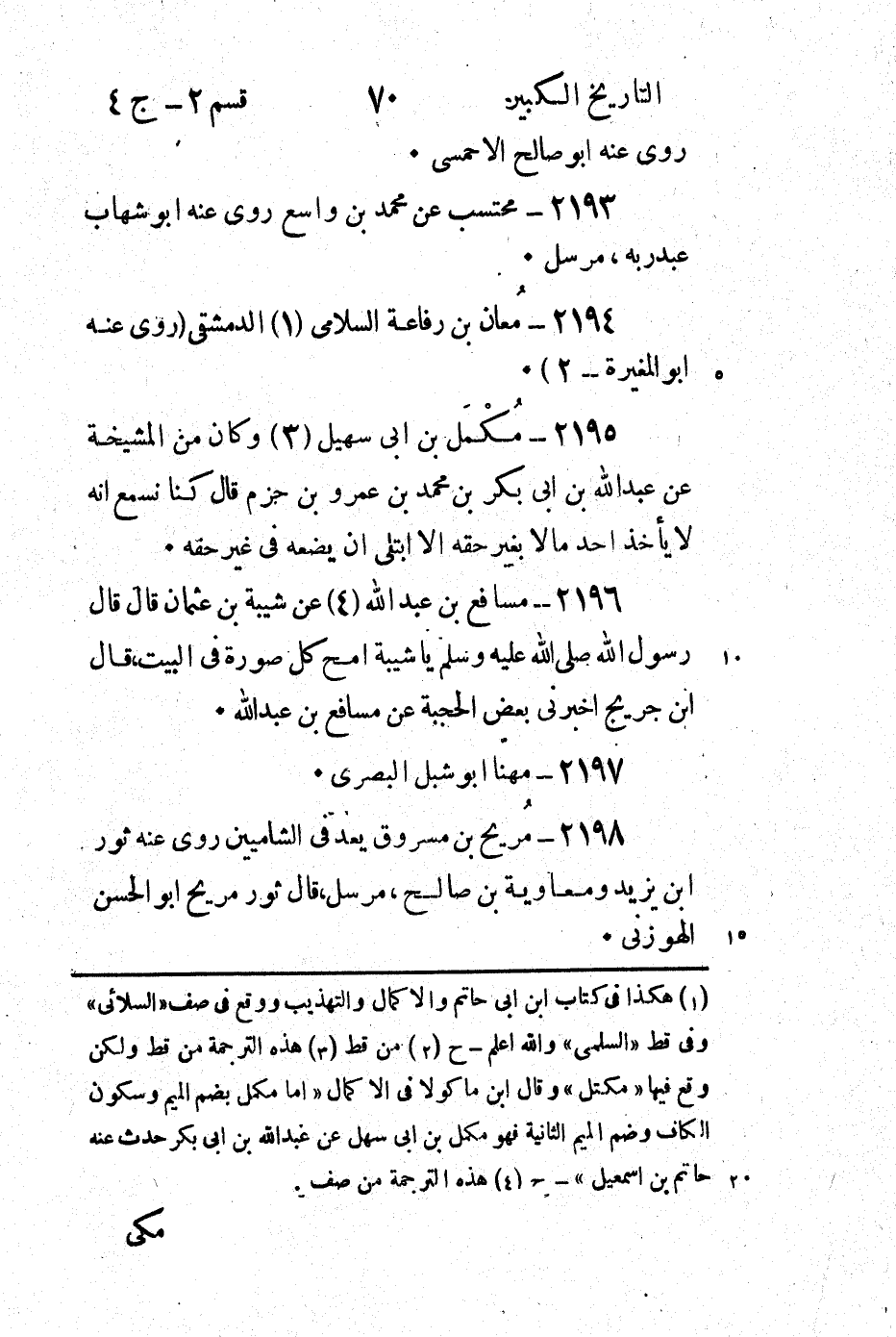 (1) هكذا في كتاب ابن أبي حاتم والاكمال والتهذيب ووقع في صف " السلائي " وفي قط " السلمي " والله أعلم - ح (2) من قط (3) هذه الترجمة من قط ولكن وقع فيها " مكتل " وقال ابن مأكولا في الاكمال " أما مكمل بضم الميم وسكون الكاف وضم الميم الثانية فهو مكمل بن أبي سهل عن عبد الله بن أبي بكر حدث عنه حاتم بن اسمعيل " - ح (4) هذه الترجمة من صف.