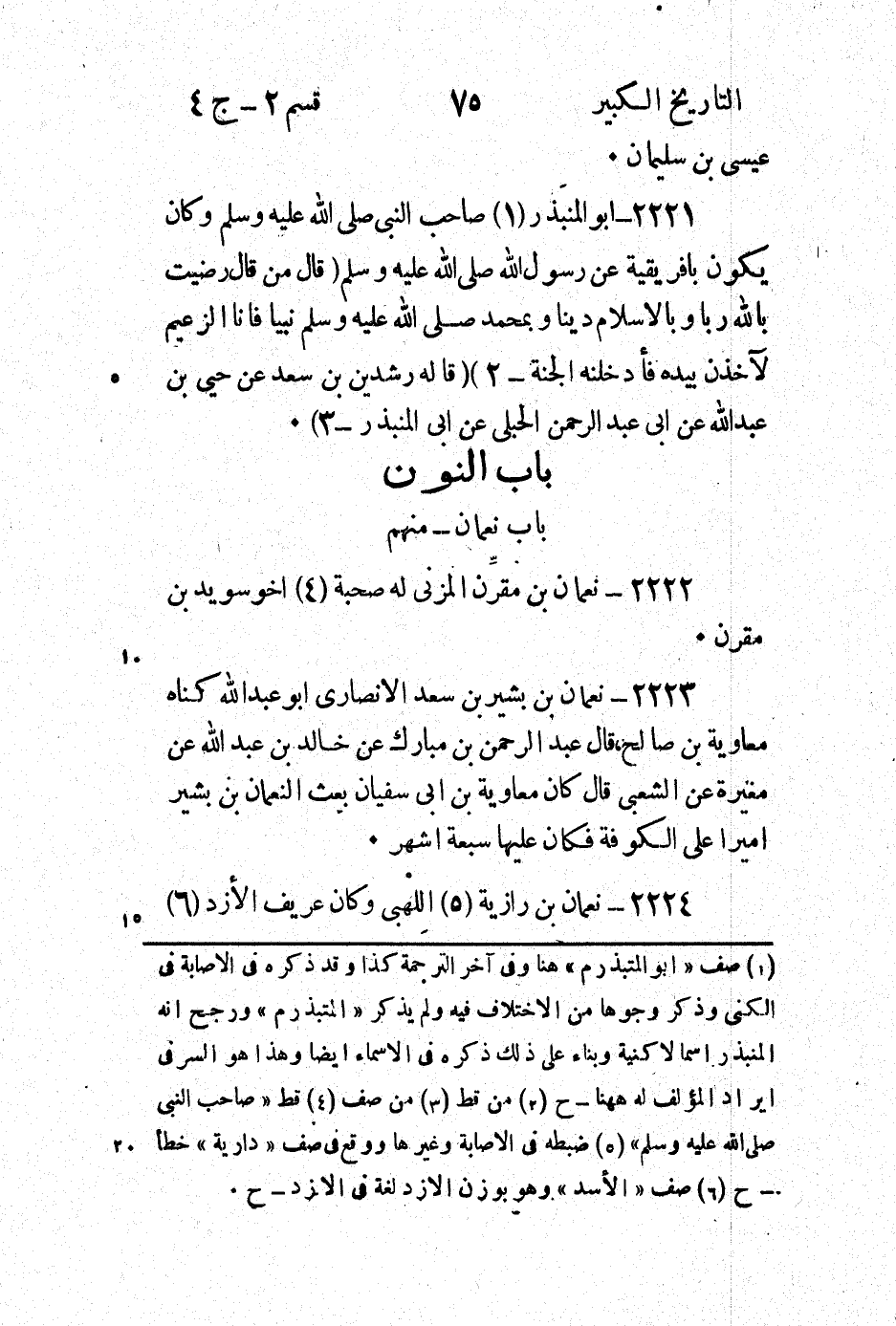 (1) صف " أبو المتبذرم " هنا وفي آخر الترجمة كذا وقد ذكره في الاصابة في الكنى وذكر وجوها من الاختلاف فيه ولم يذكر " المتبذرم " ورجح إنه المنبذر اسما لا كنية وبناء على ذلك ذكره في الاسماء أيضا وهذا هو السر في إيراد المؤلف له ههنا - ح (2) من قط (3) من صف (4) قط " صاحب النبي صلى الله عليه وسلم " (5) ضبطه في الاصابة وغيرها ووقع في صف " دارية " خطأ - ح (6) صف " الاسد " وهو بوزن الازد لغة في الازد - ح.